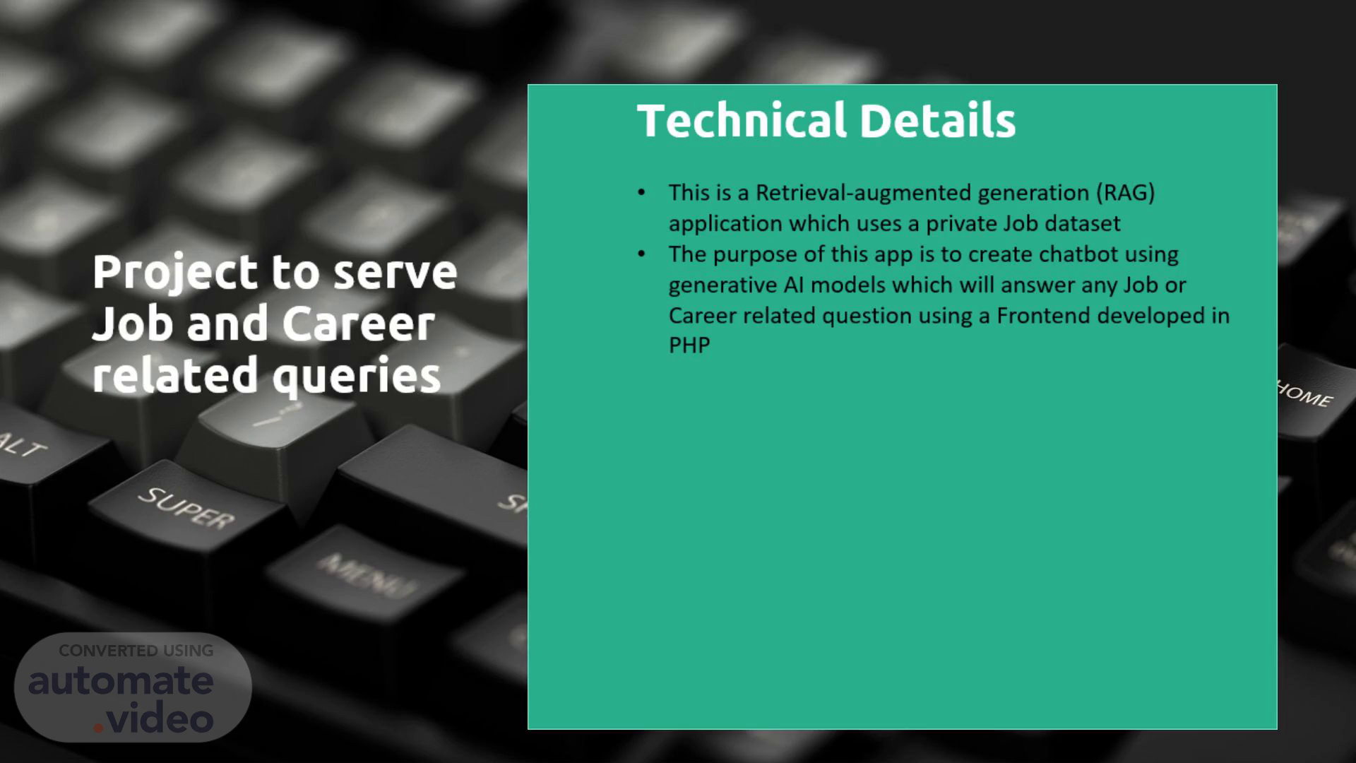 [Audio] This is a Retrieval-augmented generation (RAG) application which uses a private Job dataset The purpose of this app is to create chatbot using generative AI models which will answer any Job or Career related question using a Frontend developed in PHP.