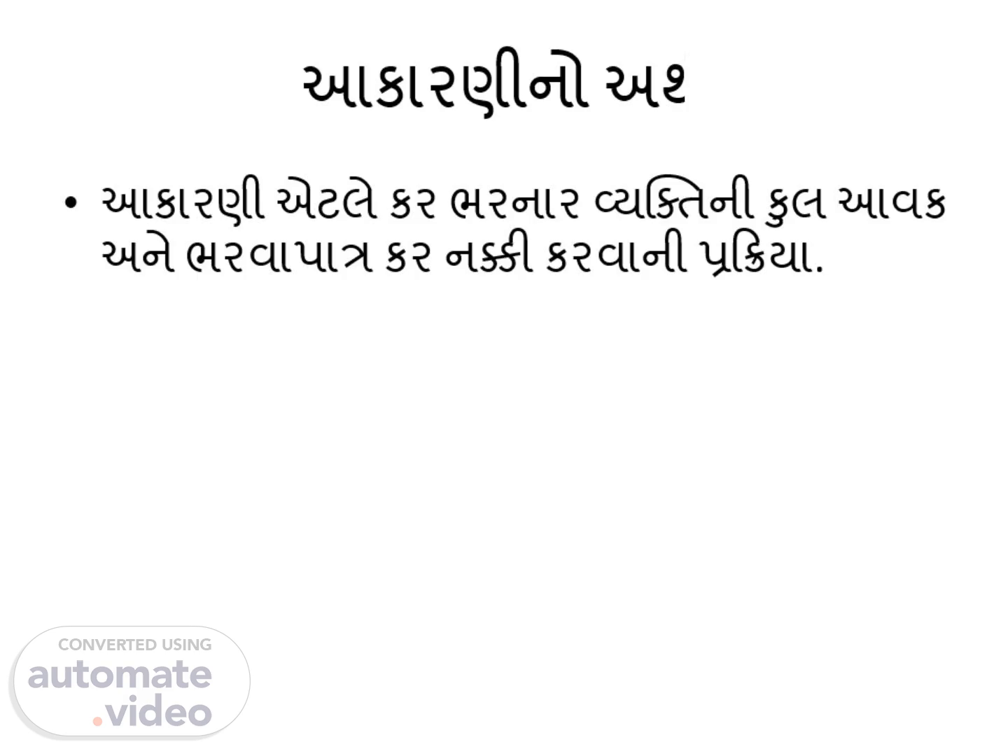 આકારણીનો અર્થ. આકારણી એટલે કર ભરનાર વ્યક્તિની કુલ આવક અને ભરવાપાત્ર કર નક્કી કરવાની પ્રક્રિયા..