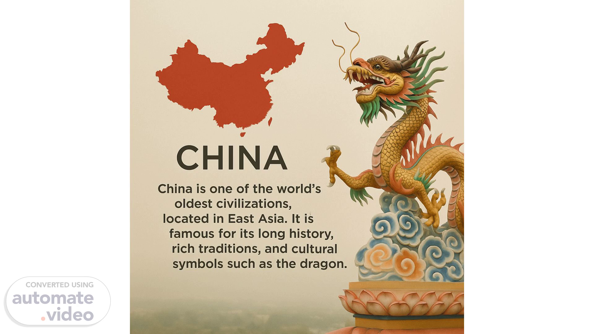 _a CHINA China is one of the world's oldest civilizations, located in East Asia. It is famous for its long history, rich traditions, and cultural symbols such as the dragon..