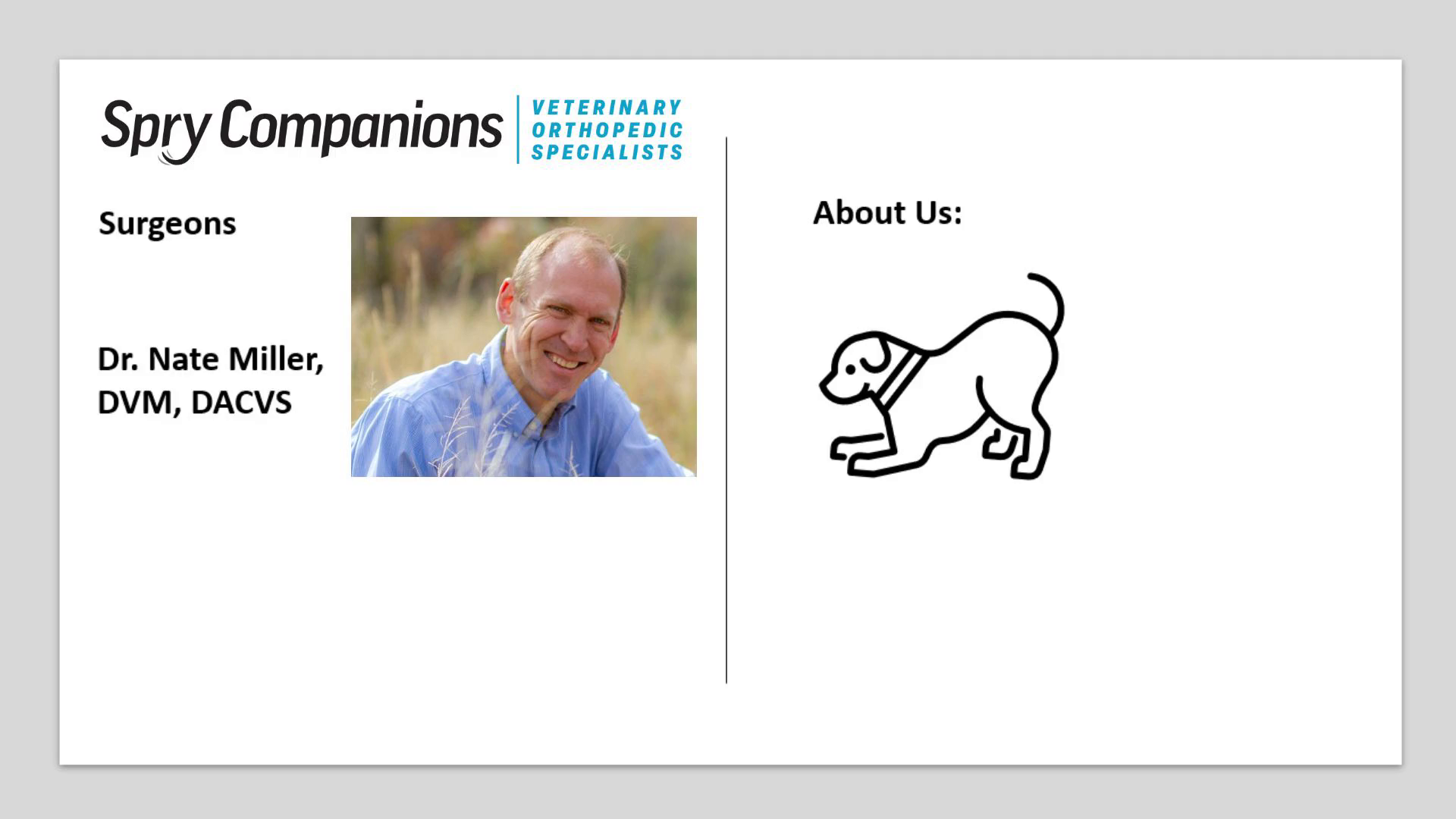 [Audio] Spry Companions surgical center is led by the extraordinary talents and care of Dr. Nate Miller and Dr. Lee Breshears…….. Dr. Miller grew up in Evergreen, Colorado. He received his undergraduate degree from Harvard University and returned to Colorado, graduating from Colorado State University Veterinary School. He was intern of the year at North Carolina State University and completed his surgical residency at the University of Georgia in 2002. He became board certified by the American College of Veterinary Surgeons in 2004. Dr. Miller has practiced in Denver, CO and Santa Cruz, CA. He returned to Colorado in 2012 and joined the team at Colorado Canine Orthopedics in Colorado Springs. He spent 11 years there performing orthopedic surgery, developing new techniques, and helping advance canine joint replacement as an instructor for the Kyon hip replacement system. Dr. Miller has extensive experience in arthroscopy and has been an instructor in courses nationally. He has performed over 700 canine hip replacements, has been an instructor for hip replacement for 7 years, teaching and lecturing internationally, and helped with development and refinement of implant systems. He has a strong interest in the use of 3D modelling to aid in correction of limb deformities, including use of CT modelling to plan surgical correction as well as printing of patient specific surgical guides to improve the precision and repeatability of complex corrections. Dr. Miller loves that he gets to help pets get back to doing the things they love to do and appreciates the joy that brings to their owners. Getting outside with your dog is one of the joys in life (for pet and owner both), and Dr. Miller appreciates that he can help bring that joy about..