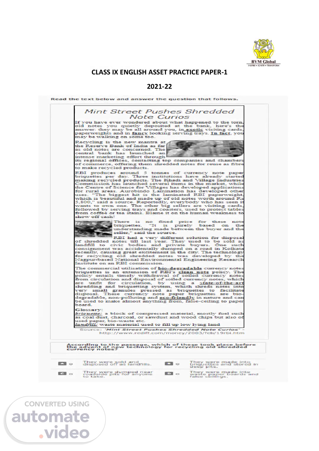 . . CLASS IX ENGLISH ASSET PRACTICE PAPER-1. 2021-22.