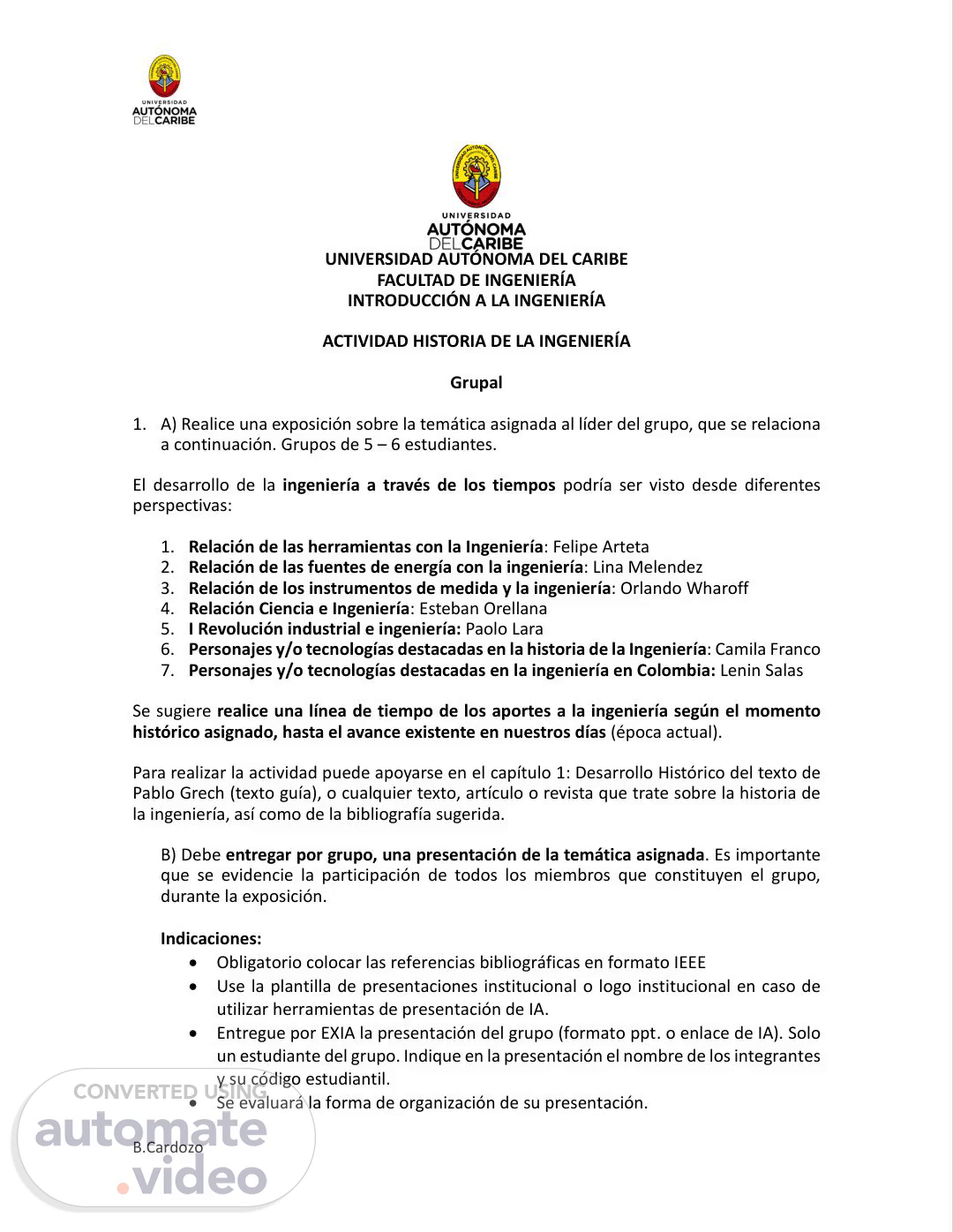 B.Cardozo UNIVERSIDAD AUTÓNOMA DEL CARIBE FACULTAD DE INGENIERÍA INTRODUCCIÓN A LA INGENIERÍA ACTIVIDAD HISTORIA DE LA INGENIERÍA Grupal 1. A) Realice una exposición sobre la temática asignada al líder del grupo, que se relaciona a continuación. Grupos de 5 – 6 estudiantes. El desarrollo de la ingeniería a través de los tiempos podría ser visto desde diferentes perspectivas: 1. Relación de las herramientas con la Ingeniería: Felipe Arteta 2. Relación de las fuentes de energía con la ingeniería: Lina Melendez 3. Relación de los instrumentos de medida y la ingeniería: Orlando Wharoff 4. Relación Ciencia e Ingeniería: Esteban Orellana 5. I Revolución industrial e ingeniería: Paolo Lara 6. Personajes y/o tecnologías destacadas en la historia de la Ingeniería: Camila Franco 7. Personajes y/o tecnologías destacadas en la ingeniería en Colombia: Lenin Salas Se sugiere realice una línea de tiempo de los aportes a la ingeniería según el momento histórico asignado, hasta el avance existente en nuestros días (época actual). Para realizar la actividad puede apoyarse en el capítulo 1: Desarrollo Histórico del texto de Pablo Grech (texto guía), o cualquier texto, artículo o revista que trate sobre la historia de la ingeniería, así como de la bibliografía sugerida. B) Debe entregar por grupo, una presentación de la temática asignada. Es importante que se evidencie la participación de todos los miembros que constituyen el grupo, durante la exposición. Indicaciones: • Obligatorio colocar las referencias bibliográficas en formato IEEE • Use la plantilla de presentaciones institucional o logo institucional en caso de utilizar herramientas de presentación de IA. • Entregue por EXIA la presentación del grupo (formato ppt. o enlace de IA). Solo un estudiante del grupo. Indique en la presentación el nombre de los integrantes y su código estudiantil. • Se evaluará la forma de organización de su presentación..