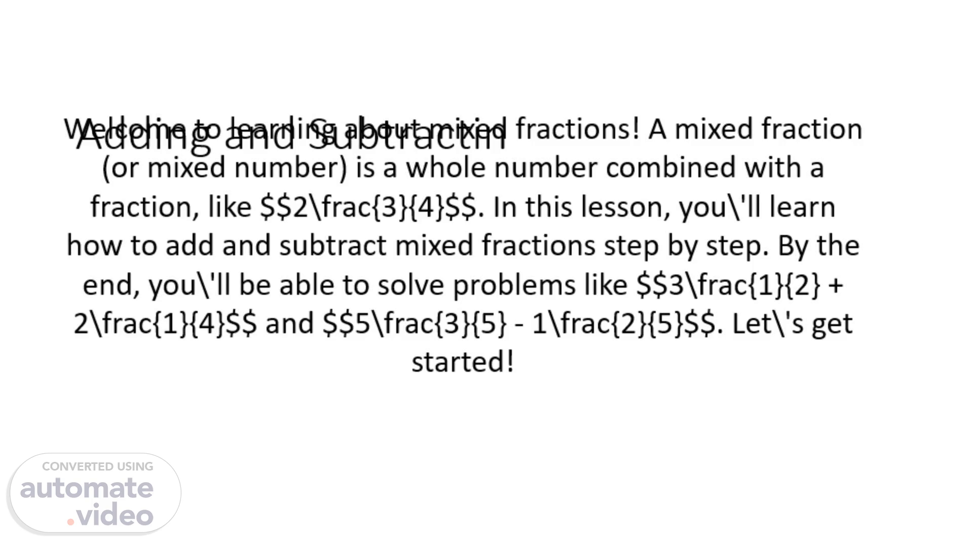 Adding and Subtracting Mixed Fractions. Welcome to learning about mixed fractions! A mixed fraction (or mixed number) is a whole number combined with a fraction, like $$2\frac$$. In this lesson, you\'ll learn how to add and subtract mixed fractions step by step. By the end, you\'ll be able to solve problems like $$3\frac + 2\frac$$ and $$5\frac - 1\frac$$. Let\'s get started!.