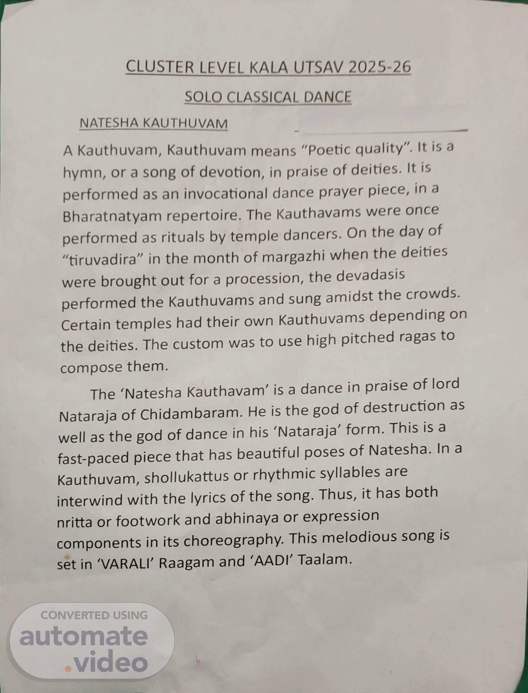 CLUSTER LEVEL KALA UTSAV 2025-26 SOLO CLASSICAL DANCE NATESHA KAUTHUVAM A Kauthuvam, Kauthuvam means "Poetic quality". It is a hymn, or a song of devotion, in praise of deities. It is performed as an invocational dance prayer piece, in a Bharatnatyam repertoire. The Kauthavams were once performed as rituals by temple dancers. On the day of "tiruvadira" in the month of margazhi when the deities were brought out for a procession, the devadasis performed the Kauthuvams and sung amidst the crowds. Certain temples had their own Kauthuvams depending on the deities. The custom was to use high pitched ragas to compose themn. The 'Natesha Kauthavam' is a dance in praise of lord Nataraja of Chidambaram. He is the god of destruction as well as the god of dance in his Nataraja' form. This is a fast-paced piece that has beautiful poses of Natesha. In a Kauthuvam, shollukattus or rhythmic syllables are interwind with the lyrics of the song. Thus, it has both nritta or footwork and abhinaya or expression components in its choreography. This melodious song is set in VARALI' Raagam and AAD' Taalam..