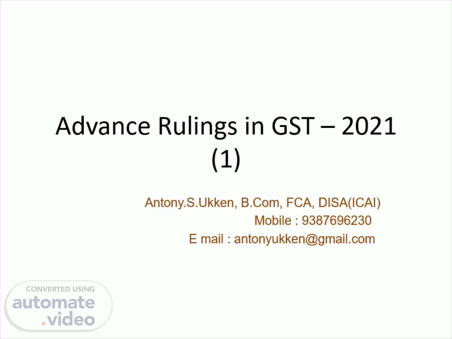 Advance Rulings in GST – 2021 (1). Antony.S.Ukken , B.Com , FCA, DISA(ICAI) Mobile : 9387696230 E mail : [email protected].