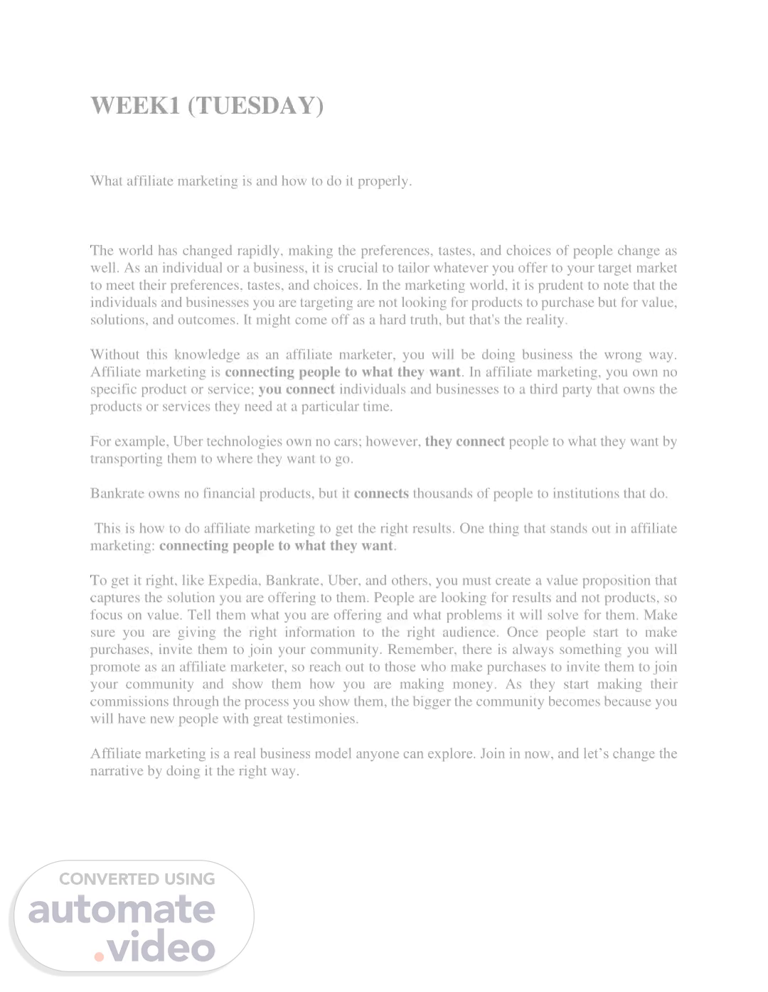 [Audio] Affiliate marketing is a process of connecting people to the products and services they need and want. As businesses become increasingly reliant on relationships with their customers, they must develop value propositions that meet the preferences, tastes, and needs of their target customers. This process involves connecting people to these third-party institutions that own the products and services, as Uber Technologies does with its ride services and Bankrate does with financial institutions. The key to success lies in creating a value proposition that captures the solution your product or service is offering and how it solves the problem of your customers. It is not about the product itself, but rather the results it produces and how it addresses the customer's needs. Additionally, once people make purchases, it is beneficial to invite them to join your community and give them insight into how you are making money. This will help grow your community and further promote your brand. Affiliate marketing is an effective business model that anyone can pursue to get the desired results. Let's work together to create a positive narrative within the industry. Join in now and let's make it happen..