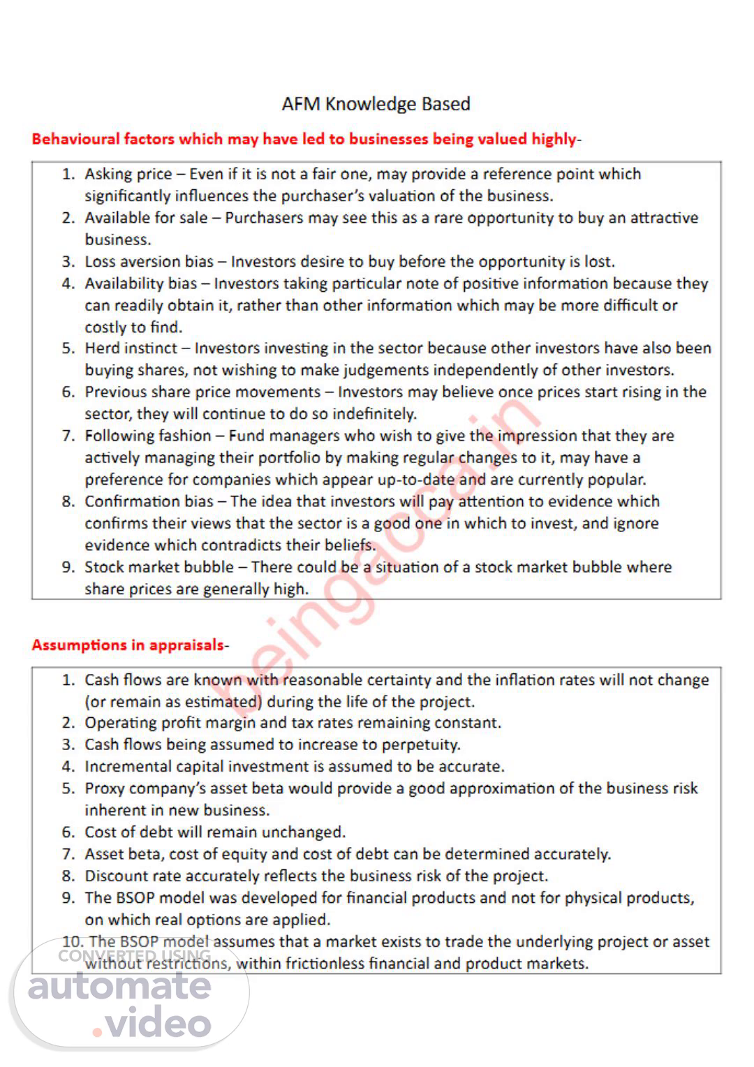 AFM Knowledge Based Behavioural factors which may have led to businesses being valued highly- 1. Asking price —Even if it is not a fair one, may provide a reference point which significantly influences the purchaser's valuation Of the business. 2. Available for sale — Purchasers may see this as a rare opportunity to buy an attractive business. 3. Loss aversion bias — Investors desire to buy before the opportunity is lost. 4. Availability bias — Investors taking particular note Of positive information because they can readily obtain it, rather than other information which may be more difficult or costly to find. 5. Herd instinct — Investors investing in the sector because other investors have also been buying shares, not wishing to make judgements independently Of other investors. 6. Previous share price movements — Investors may believe once prices start rising in the sector, they will continue to do so indefinitely. 7. Following fashion — Fund managers who wish to give the impression that they are actively managing their portfolio by making regular changes to it, may have a preference for companies which appear up-to-date and are currently popular. 8. Confirmation bias —The idea that investors will pay attention to evidence which confirms their views that the sector is a good one in which to invest, and ignore evidence which contradicts their beliefs. 9. Stock market bubble — There could be a situation of a stock market bubble where share prices are generally high. Assumptions in appraisals- Cash flows are known with reasonable certainty and the inflation rates will not change I. (or remain as estimated) during the life of the project. Operating profit margin and tax rates remaining constant. 2. Cash flows being assumed to increase to perpetuity. 3. Incremental capital investment is assumed to be accurate. 4. Proxy company's asset beta would provide a good approximation Of the business risk 5. inherent in new business. Cost Of debt will remain unchanged. 6. Asset beta, cost of equity and cost of debt can be determined accurately. 7. Discount rate accu rately reflects the business risk of the project. 8. The BSOP model was developed for financial products and not for physical products, 9. on which real options are applied. 10. The BSOP model assumes that a market exists to trade the underlying project or asset without restrictions, within frictionless financial and product markets..