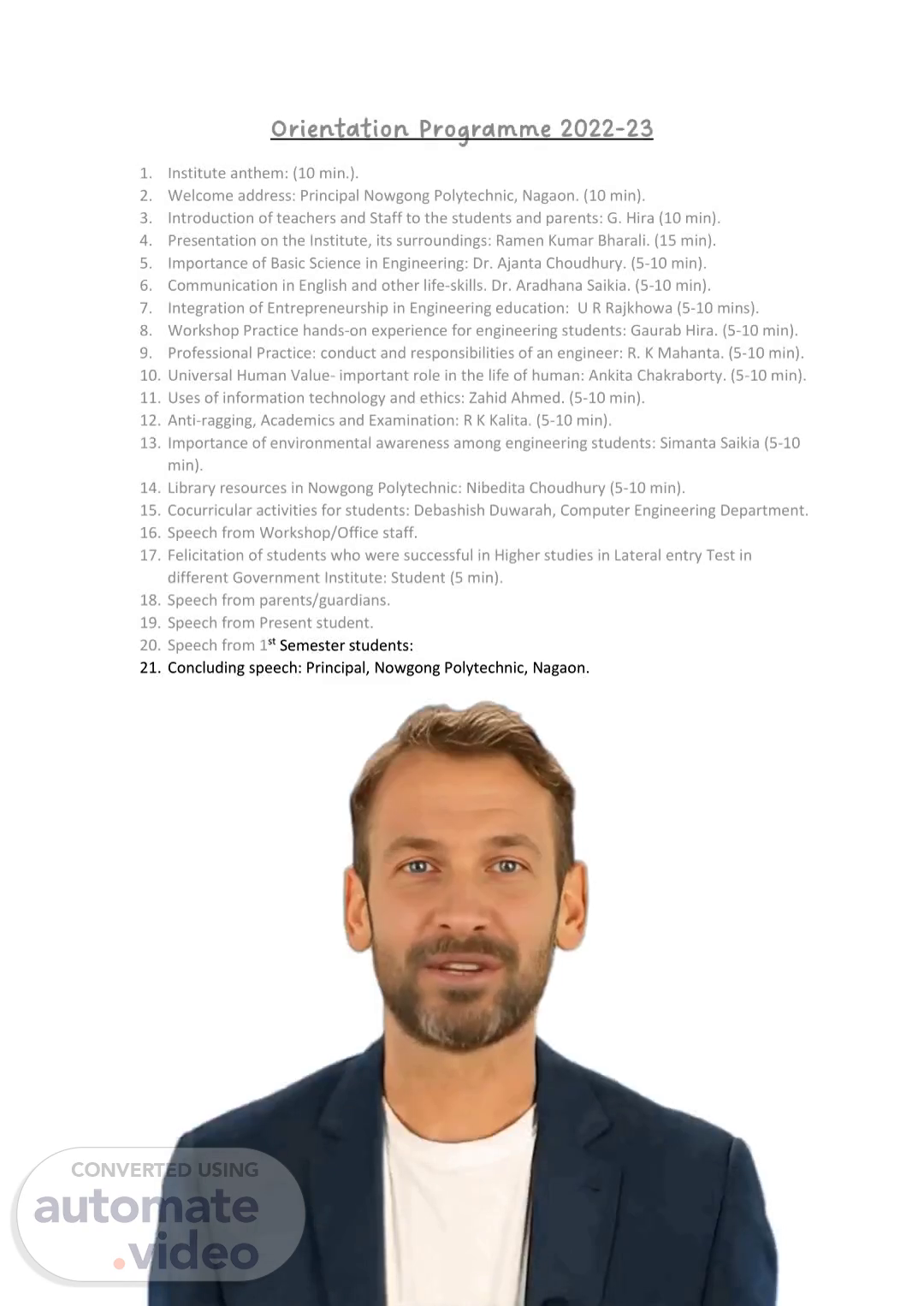 [Virtual Presenter] Good day everyone. Today I am here to share with you the Orientation Programme 2022-23 for Nowgong Polytechnic, Nagaon. This programme is designed to fill the students with knowledge and guidance in all aspects necessary for completing their engineering studies. Starting of the Orientation Programme is the Institute anthem followed by the welcome address from the Principal. After that, you will be introduced to the teachers and staff of the Institute. The programme will then move on to a presentation on the Institute and its surroundings followed by an emphasis on the importance of basic science in engineering. After that, we will continue with a session on communication in English and other life skills. The programme then moves on to integration of entrepreneurship in engineering education and a workshop for hands on experiences for engineering students. We will also talk about professional practice and why it is important for engineers, and also the universal human values and their importance in life. We will also discuss the uses of Information Technology and Ethics, followed by a discussion on Anti-Ragging, Academics and Examination. We will also put importance on environmental awareness among engineering students and library resources in Nowgong Polytechnic. The programme will also have cocurricular activities for students followed by speeches from workshop/office staff, successful students in higher studies, parents/guardians and present student. To round off the Orientation Programme, there will be a speech by the Principal. I'm sure this Orientation Programme 2022-23 will be informative and beneficial for all our students. Thank you..
