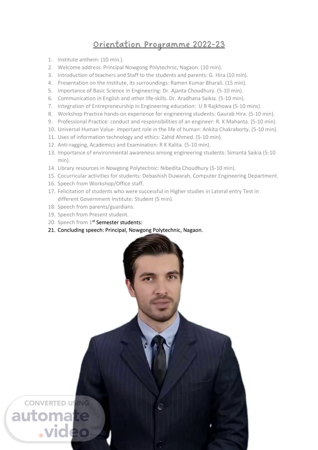 [Virtual Presenter] Good morning everyone! Today I'd like to welcome you to the Orientation Programme 2022-23. As you can see, there's a lot to cover in this session. We have an institute anthem to introduce, a presentation on the institute and its surroundings, the importance of basic science in engineering, communication in English and other life-skills, integration of entrepreneurship in engineering education, a workshop practice hands-on experience for engineering students, professional practice and conduct as an engineer, discussion of universal human values and the importance of information technology and ethics. These are all important topics and I'm sure we will learn a great deal from them. So, let's get started!.