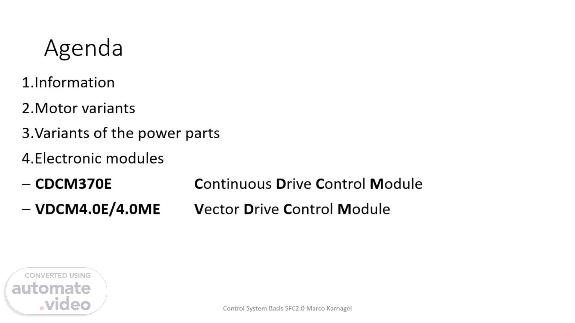 [Audio] Agenda, Information Motor variants, Variants of the power parts, Electronic modules CDCM370E Continuous Drive Control Module VDCM4.0E/4.0ME Vector Drive Control Module.