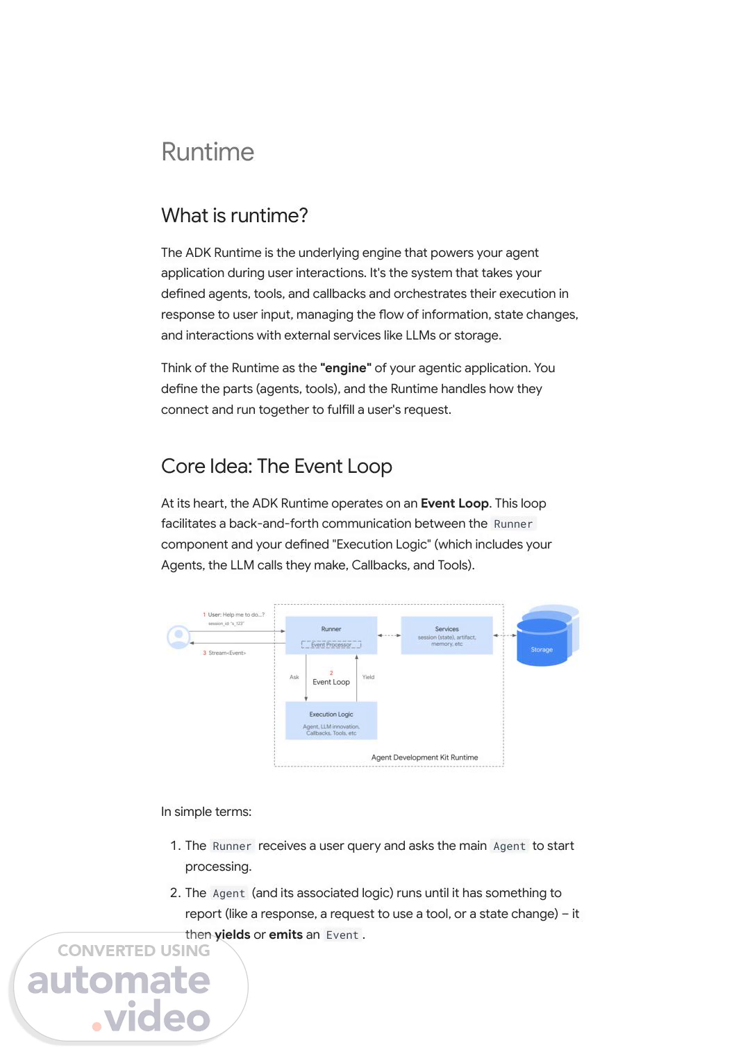 [Audio] // For this conceptual example, we'll emit the event, and then simulate the "resume" // as a subsequent operation in the Flowable chain. return Flowable.just(eventWithStateChange) // Step 2: Yield the event .concatMap(yieldedEvent -> RUNNER CONCEPTUALLY PROCESSES & COMMITS THE EVENT >>>>>>>>>>>> // At this point, in a real runner, ctx.session().appendEvent(yieldedEvent) would have been called // by the Runner, and ctx.session().state() would be updated. // Since we are *inside* the agent's conceptual logic trying to model this, // we assume the Runner's action has implicitly updated our 'ctx.session()'. // 3. Resume execution. // Now, the state committed by the Runner (via sessionService.appendEvent) // is reliably reflected in ctx.session().state(). Object val = ctx.session().state().get("field_1"); // here `val` is guaranteed to be "value_2" because the `sessionService.appendEvent` // called by the Runner would have updated the session state within the `ctx` object. System.out.println("Resumed execution. Value of field_1 is now: " + val); // ... subsequent code continues ... // If this subsequent code needs to yield another event, it would do so here. This cooperative yield/pause/resume cycle between the Runner and your Execution Logic, mediated by Event objects, forms the core of the ADK Runtime. Key components of the Runtime Several components work together within the ADK Runtime to execute an agent invocation. Understanding their roles clarifies how the event loop functions: 1. Runner Role: The main entry point and orchestrator for a single user query ( run_async )..