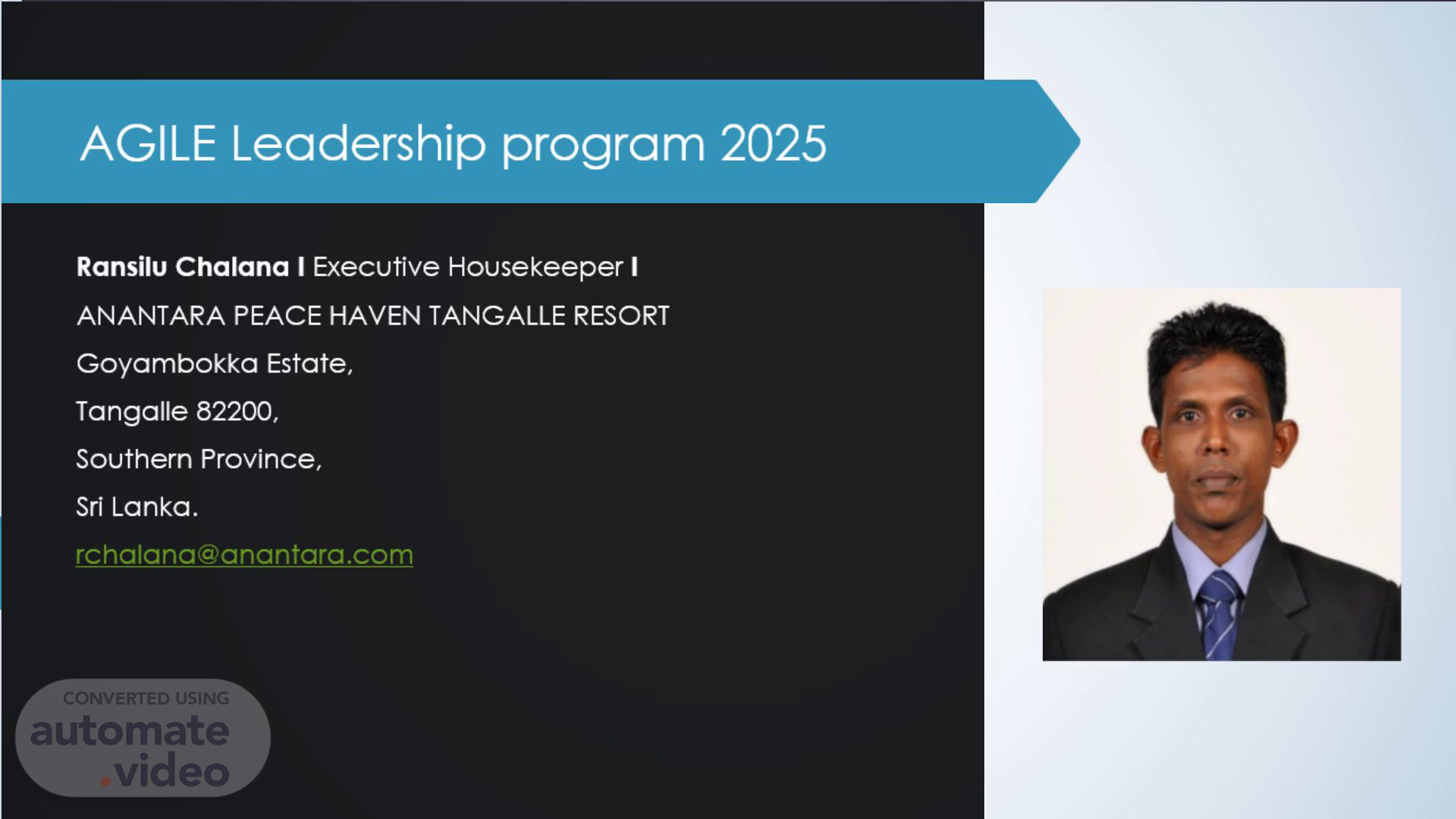 AGILE Leadership program 2025. Ransilu Chalana I Executive Housekeeper I ANANTARA PEACE HAVEN TANGALLE RESORT Goyambokka Estate, Tangalle 82200, Southern Province, Sri Lanka. [email protected].