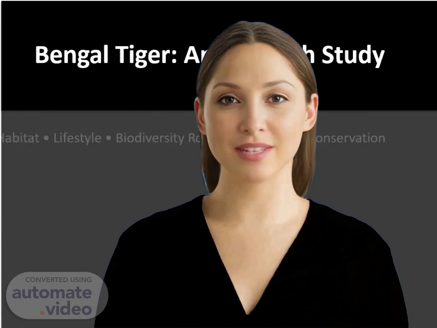 [Virtual Presenter] HI everyone. Today, I’d like to talk about one of the most iconic and majestic animals on our planet — the Bengal tiger. Known for its striking orange coat with black stripes, the Bengal tiger is not just a symbol of strength and grace, but also a vital part of India’s rich biodiversity. This magnificent creature plays a crucial role in maintaining the balance of our forest ecosystems. As a top predator, the tiger controls the population of herbivores, which in turn protects vegetation and supports the entire food chain. Sadly, despite its cultural and ecological importance, the Bengal tiger faces serious threats — including habitat loss, poaching, and human-wildlife conflict. With fewer than 3,000 left in the wild, saving the Bengal tiger is not just about saving a species — it’s about protecting the forests, the rivers, and the natural systems that sustain life for all of us. So let’s explore why the Bengal tiger matters, what challenges it faces, and how we can be part of the solution.".