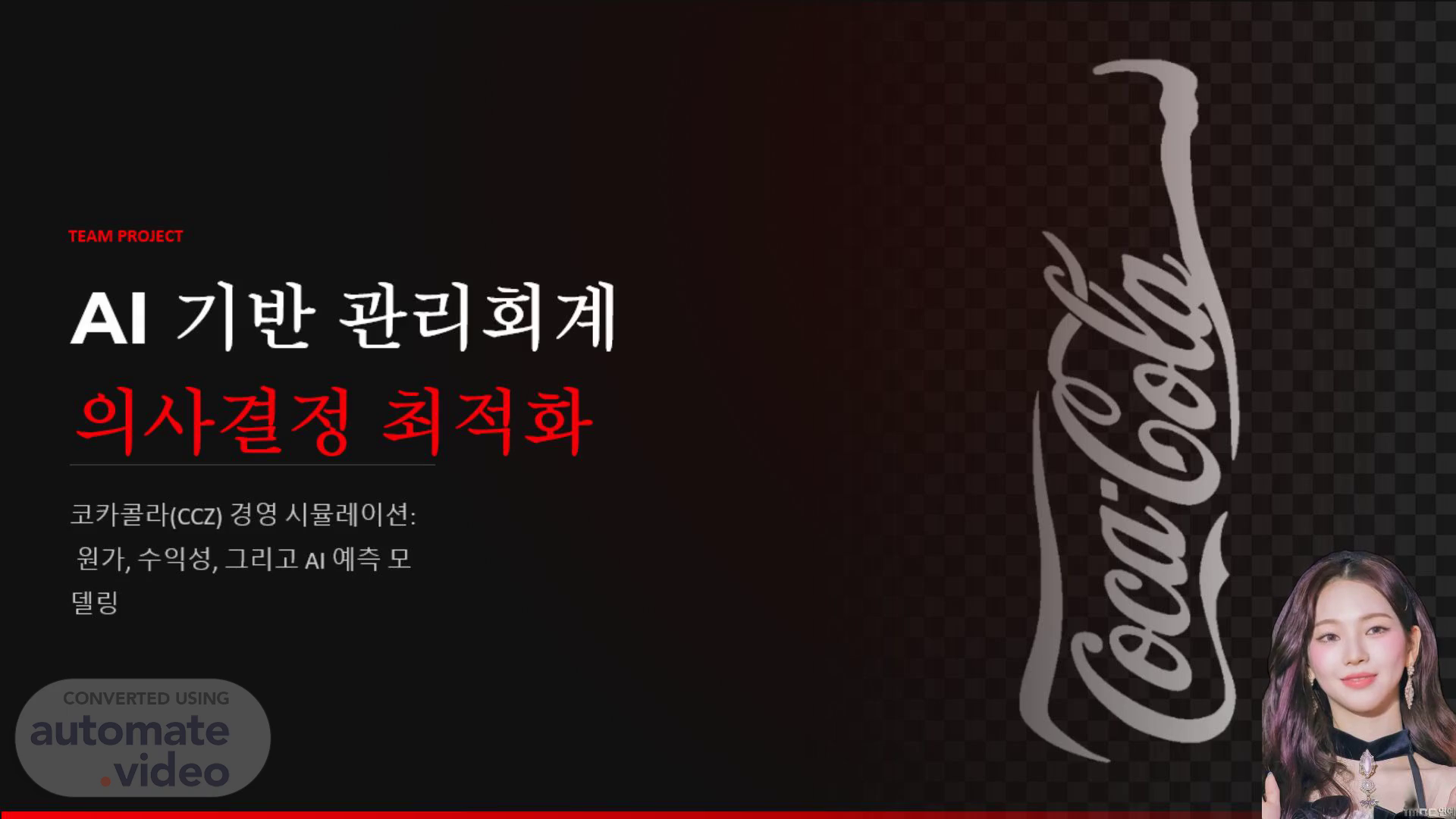 Team Project A-I 기반 관리회계 의사결정 최적화 코카콜라(C-C-Z--) 경영 시뮬레이션: 원가, 수익성, 그리고 A-I 예측 모델링 1. 도입 (Opening) 슬라이드 1: 제목 (Coca Cola 로고와 함께) 안녕하십니까. 오늘 발표를 맡은 [본인 이름]입니다. 저희 팀 프로젝트 주제는 **'ai 기반 관리회계 의사결정 최적화'**이며, 특히 코카콜라 제로(ccz) 경영 시뮬레이션을 통해 원가, 수익성, 그리고 Ai 예측 모델링의 중요성을 분석했습니다. 우리는 복잡한 비즈니스 환경에서 직관이 아닌 데이터 기반의 의사결정 시스템이 어떻게 기업의 지속 가능한 성장을 담보할 수 있는지 보여드리고자 합니다..
