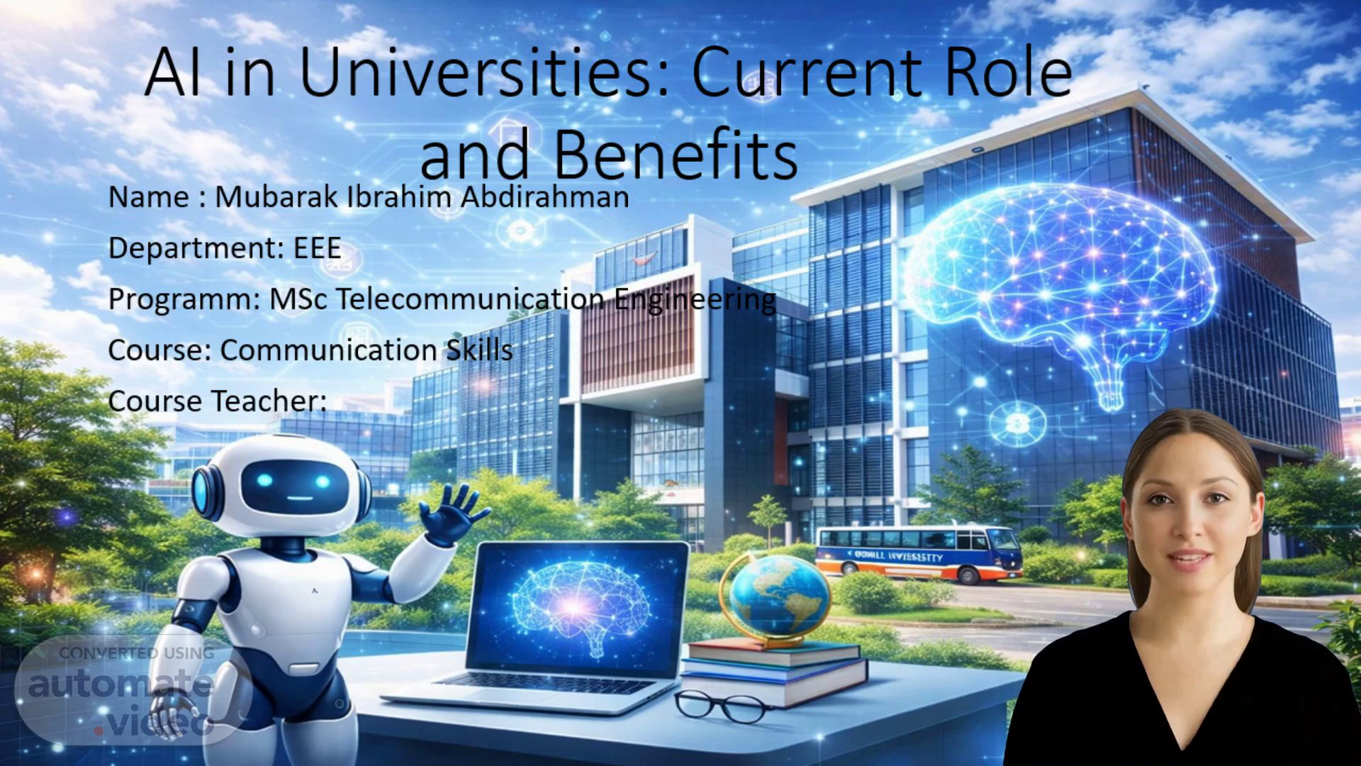[Virtual Presenter] AI is increasingly being adopted by universities worldwide to enhance student learning experiences. One of the primary ways AI is being utilized is through personalized learning systems that tailor educational content to individual students' needs and abilities. These systems use machine learning algorithms to analyze data from various sources such as grades, attendance records, and online activity. By providing tailored learning materials, AI can help bridge the gap between different learning styles and abilities. Furthermore, AI-powered tools are being used to automate administrative tasks, freeing up faculty time for more critical tasks like teaching and research..