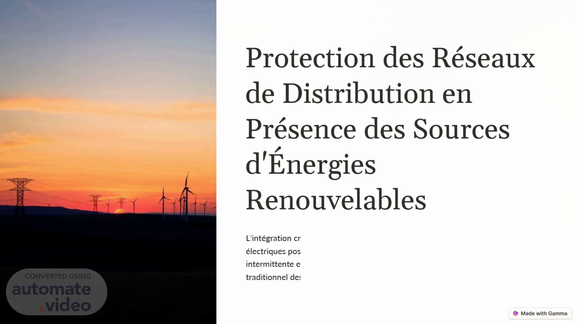 [Audio] Chers spectateurs, nous sommes arrivés à la conclusion de notre présentation sur l'intégration des sources d'énergie renouvelable dans les réseaux électriques. Comme vous avez pu le constater tout au long de cette présentation, cette transition énergétique apporte de nouveaux défis en matière de protection des installations en raison de leur nature intermittente et décentralisée. La protection des réseaux de distribution est essentielle pour assurer une transition énergétique réussie en présence de ces sources d'énergie renouvelable. C'est pourquoi il est crucial d'utiliser des solutions de protection adaptées, en combinant des systèmes de communication avancés et des systèmes intelligents de gestion de l'énergie. Grâce à ces technologies innovantes, nous sommes capables de construire un avenir énergétique durable, en harmonie avec notre environnement. Ces avancées nous permettent de relever les défis actuels et de garantir une transition énergétique réussie. Nous vous remercions d'avoir suivi notre présentation et espérons que vous avez pu en apprendre davantage sur les enjeux de l'intégration des sources d'énergie renouvelable dans les réseaux électriques. Nous sommes convaincus qu'avec des solutions adaptées, nous pouvons bâtir un avenir énergétique plus durable et respectueux de notre planète. Merci encore et à bientôt..