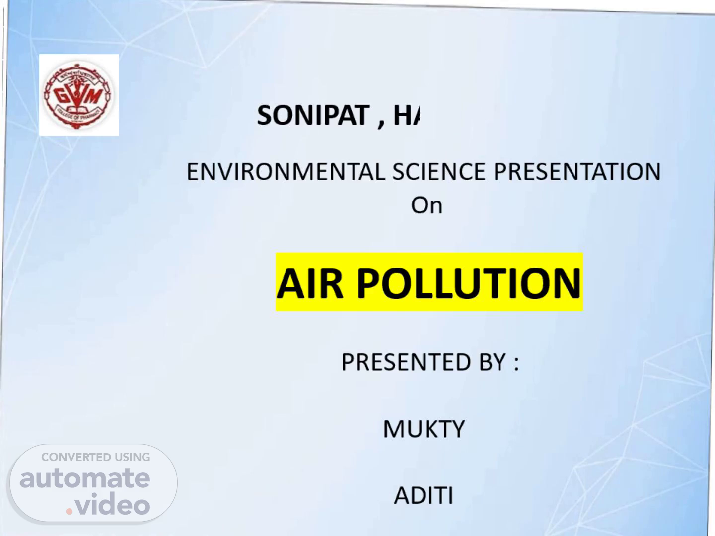 G.V.M COLLEGE OF PHARMACY. SONIPAT , HARYANA. ENVIRONMENTAL SCIENCE PRESENTATION On AIR POLLUTION PRESENTED BY : MUKTY ADITI.