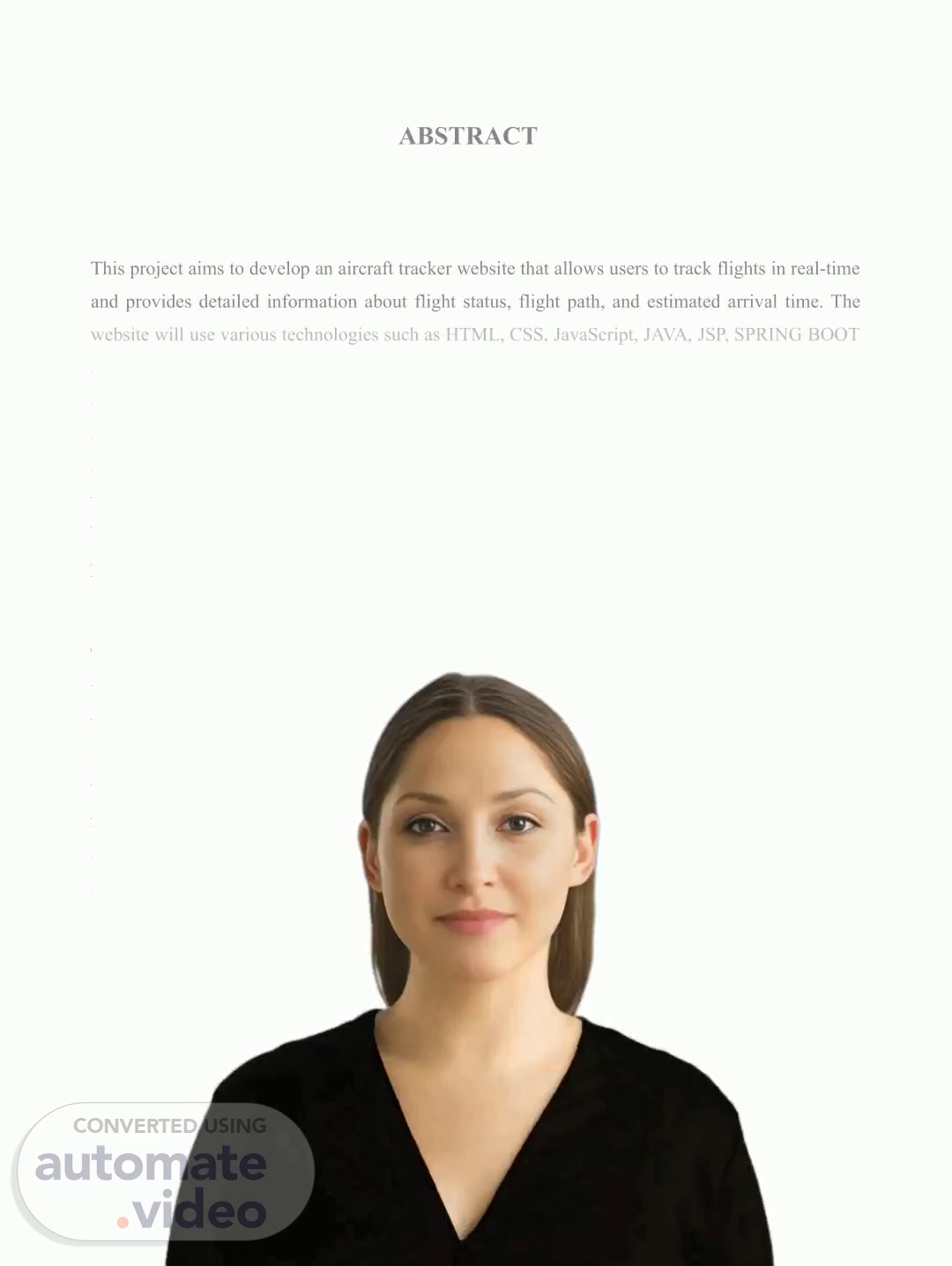 [Virtual Presenter] Today, technology and access to data have caused a surge in the ability to track aircraft in real-time. As part of this project, we are designing a website to provide users with a easy-to-use interface to monitor flight statuses and track aircraft in real-time. Our website will employ a combination of technologies and data processing techniques to obtain and display the most accurate and up-to-date information. It will also have a map view of aircraft location and flight paths, along with detailed info about the aircraft, airports, and weather conditions. This website will provide a helpful and powerful tool for aviation enthusiasts, travelers and professionals in the industry to easily and precisely access real-time aircraft data..