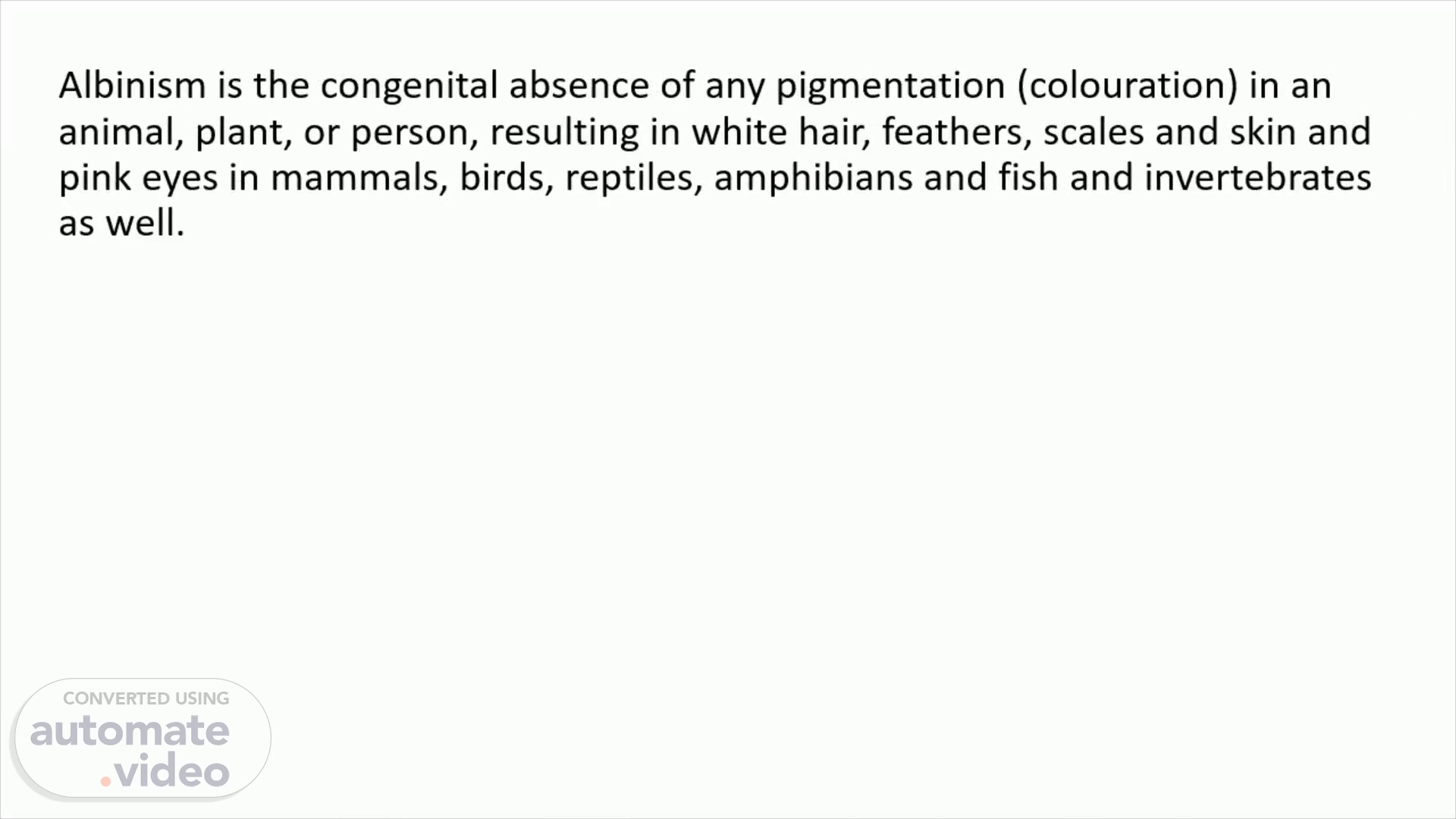 Albinism is the congenital absence of any pigmentation ( colouration ) in an animal, plant, or person, resulting in white hair, feathers, scales and skin and pink eyes in mammals, birds, reptiles, amphibians and fish and invertebrates as well..