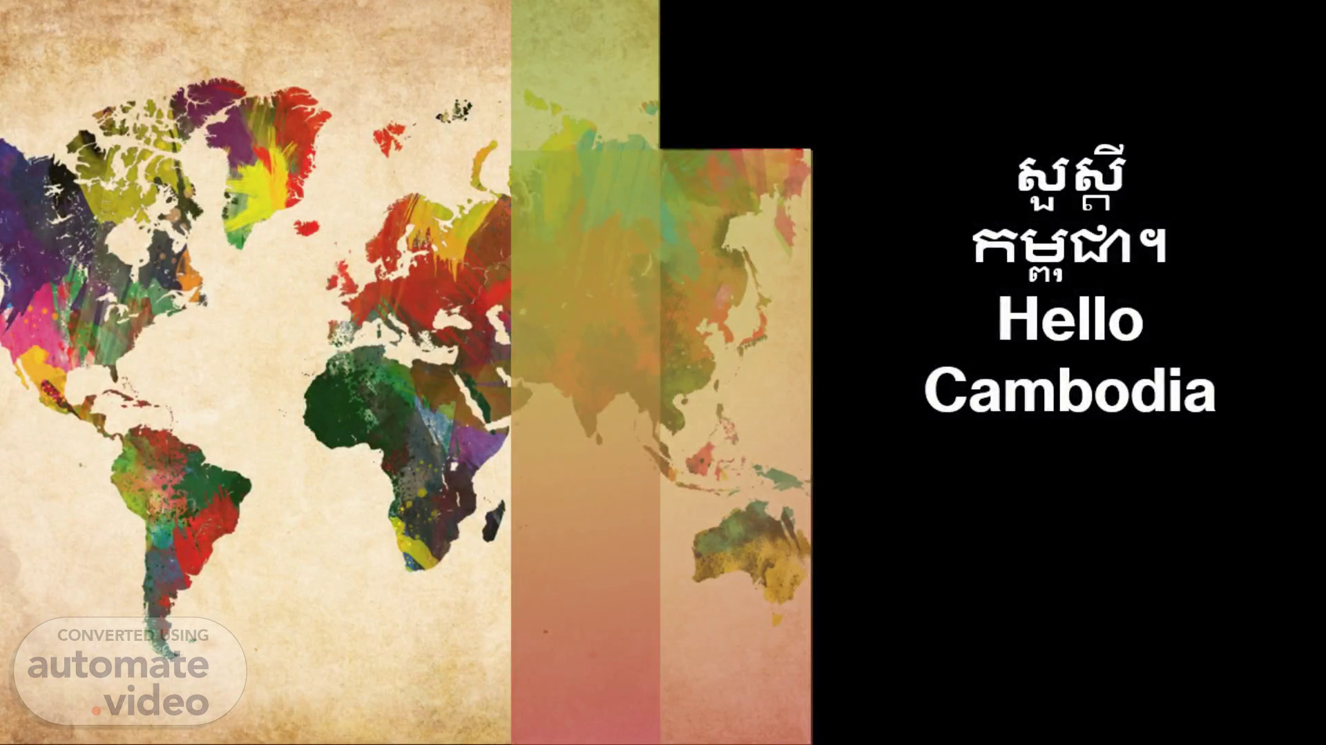 Digital rendering of a coloured world map. សួស្តី កម្ពុជា។ Hello Cambodia.