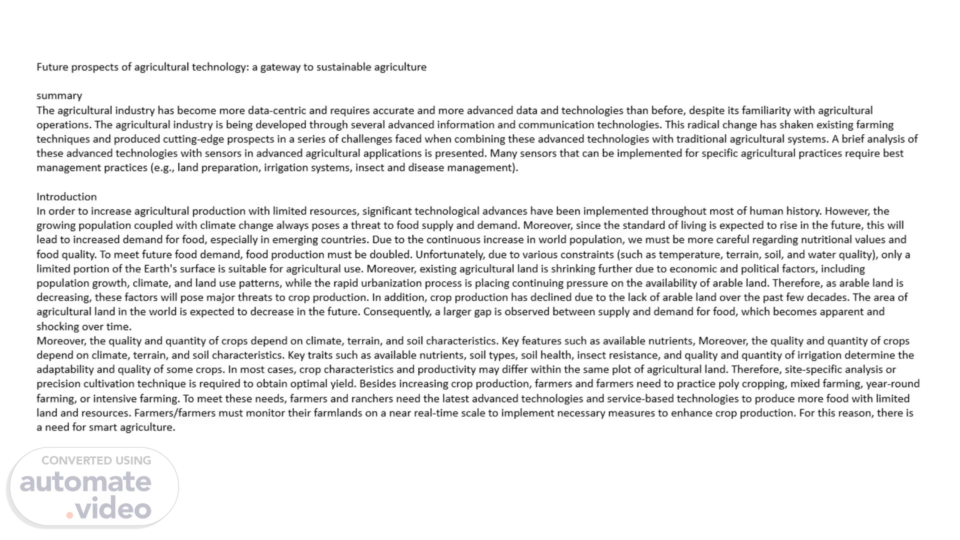 Future prospects of agricultural technology: a gateway to sustainable agriculture summary The agricultural industry has become more data-centric and requires accurate and more advanced data and technologies than before, despite its familiarity with agricultural operations. The agricultural industry is being developed through several advanced information and communication technologies. This radical change has shaken existing farming techniques and produced cutting-edge prospects in a series of challenges faced when combining these advanced technologies with traditional agricultural systems. A brief analysis of these advanced technologies with sensors in advanced agricultural applications is presented. Many sensors that can be implemented for specific agricultural practices require best management practices (e.g., land preparation, irrigation systems, insect and disease management). Introduction In order to increase agricultural production with limited resources, significant technological advances have been implemented throughout most of human history. However, the growing population coupled with climate change always poses a threat to food supply and demand. Moreover, since the standard of living is expected to rise in the future, this will lead to increased demand for food, especially in emerging countries. Due to the continuous increase in world population, we must be more careful regarding nutritional values and food quality. To meet future food demand, food production must be doubled. Unfortunately, due to various constraints (such as temperature, terrain, soil, and water quality), only a limited portion of the Earth's surface is suitable for agricultural use. Moreover, existing agricultural land is shrinking further due to economic and political factors, including population growth, climate, and land use patterns, while the rapid urbanization process is placing continuing pressure on the availability of arable land. Therefore, as arable land is decreasing, these factors will pose major threats to crop production. In addition, crop production has declined due to the lack of arable land over the past few decades. The area of agricultural land in the world is expected to decrease in the future. Consequently, a larger gap is observed between supply and demand for food, which becomes apparent and shocking over time. Moreover, the quality and quantity of crops depend on climate, terrain, and soil characteristics. Key features such as available nutrients, Moreover, the quality and quantity of crops depend on climate, terrain, and soil characteristics. Key traits such as available nutrients, soil types, soil health, insect resistance, and quality and quantity of irrigation determine the adaptability and quality of some crops. In most cases, crop characteristics and productivity may differ within the same plot of agricultural land. Therefore, site-specific analysis or precision cultivation technique is required to obtain optimal yield. Besides increasing crop production, farmers and farmers need to practice poly cropping, mixed farming, year-round farming, or intensive farming. To meet these needs, farmers and ranchers need the latest advanced technologies and service-based technologies to produce more food with limited land and resources. Farmers/farmers must monitor their farmlands on a near real-time scale to implement necessary measures to enhance crop production. For this reason, there is a need for smart agriculture..
