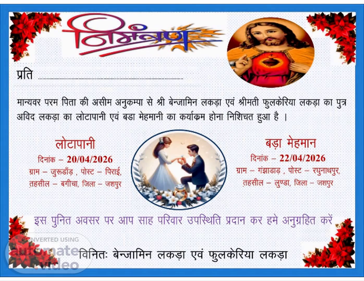 izfr - ekU;oj ije firk dh vlhe vuqdEik ls Jh csUtkfeu ydM+k ,oa Jherh Qqydsfj;k ydM+k dk iq= vfon ydM+k dk yksVkikuh ,oa cMk esgekuh dk d;kZdze gksuk fuf’kpr gqvk gS A bl iqfur volj ij vki lkg ifjokj mifLFkfr Ikznku dj ges vuqxzfgr djsa yksVkikuh fnukad & 20/04/2026 xzke & tq:Mk¡M+ ] iksLV & fijkbZ] R+kglhy & Ckxhpk] ftYkk & Tk’kiqj CkM+k esgeku fnukad & 22/04/2026 xzke & xaÖkkMkM+ ] iksLV & j?kqukFkIkqj] R+kglhy & yq.Mk] ftYkk & Tk’kiqj fofur% csUtkfeu ydM+k ,oa Qqydsfj;k ydM+k.