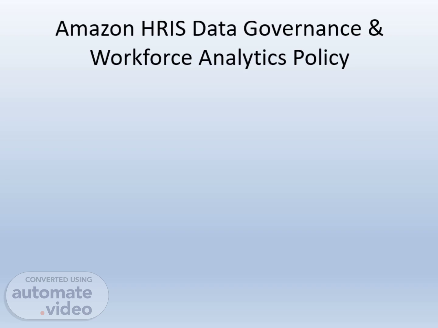 [Audio] Today I'll be walking you through my HRIS Policy and Proposal for Amazon, with an emphasis on data governance and workforce analytics. I'll be giving an overview of the main parts of my project and explaining how Amazon's HRIS supports the company's overall performance..