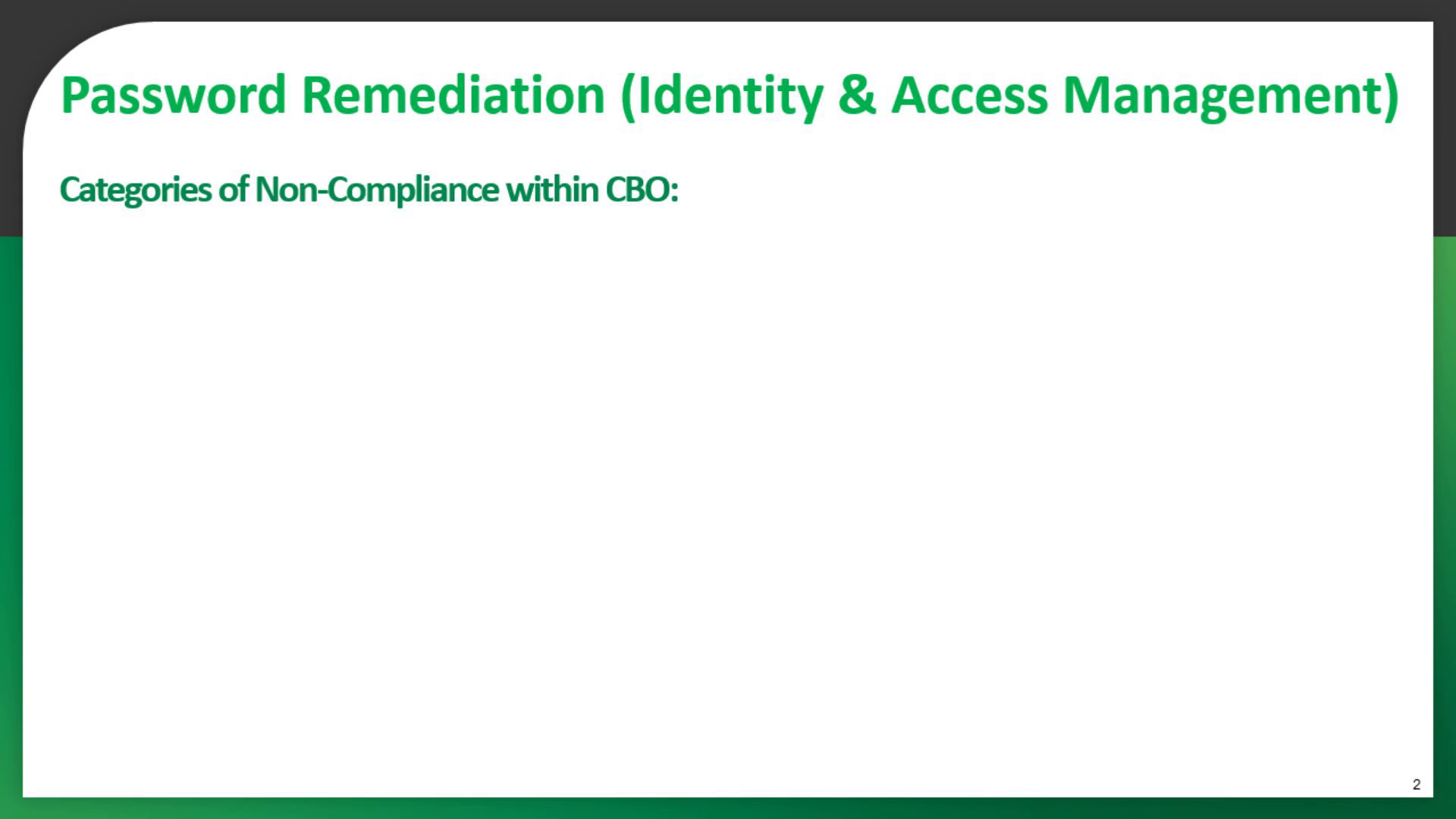 [Audio] Thank you, Kenny. Hi Everyone, I am Amber Shepherd, Responsible for the Delivery of complex changes within the Resilience portfolio and am currently working on a few projects including Password Remediation, which is the project I will be giving you a brief overview of this morning. What is Password Remediation? In a nutshell bank compliance and security requirements have become increasingly more strict over the years, due to this we at Lloyds Banking Group have a number of risks and security non compliances open to cover the Commercial Banking Online software and infrastructure not meeting or adhering to some of these security requirements and policies. The Password Remediation programme of work aims to mitigate nine of the Risks and SNCs that CBO have raised or are impacted by. These above mentioned SNCs can be categorized as follows: Weak Password is for passwords that are not in line with entropy (password strength) standards. Password Rotation is where user and non-user passwords are not rotated periodically. Credentials Encryption covers non-user credentials that are not encrypted at rest. Build Standards is for FMO RHEL servers that were not built to LBG or Kyndrl standards. And lastly CI CD communications which addresses the lack of segregation between Test and DevOps environments and the SMTP Production Servers. Which essentially means that the communications relate to coding processes, which is why the environments are not segregated and SMTP is used to support such processes When can we expect to have these issues remediated? The team and I are working on having all these nine SNCs remediated by quarter three next year. In order to be able to do that, we are and will continue to work and collaborate with a wide range of internal and external teams. Thank you for listening, I shall now pass on to Rachel to give you her update..