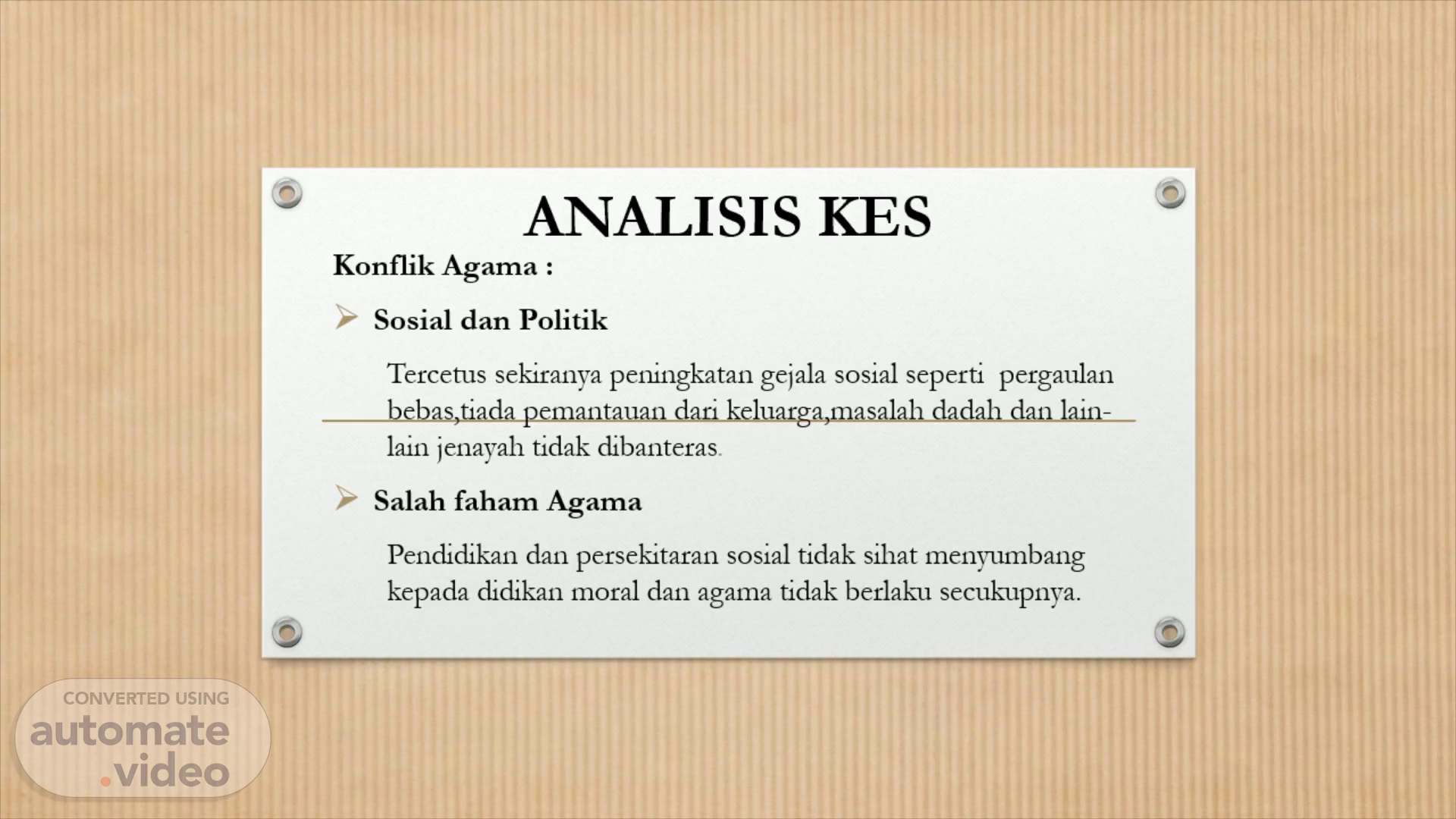 ANALISIS KES. Konflik Agama : Sosial dan Politik Tercetus sekiranya peningkatan gejala sosial seperti pergaulan bebas,tiada pemantauan dari keluarga,masalah dadah dan lain-lain jenayah tidak dibanteras . Salah faham Agama Pendidikan dan persekitaran sosial tidak sihat menyumbang kepada didikan moral dan agama tidak berlaku secukupnya ..