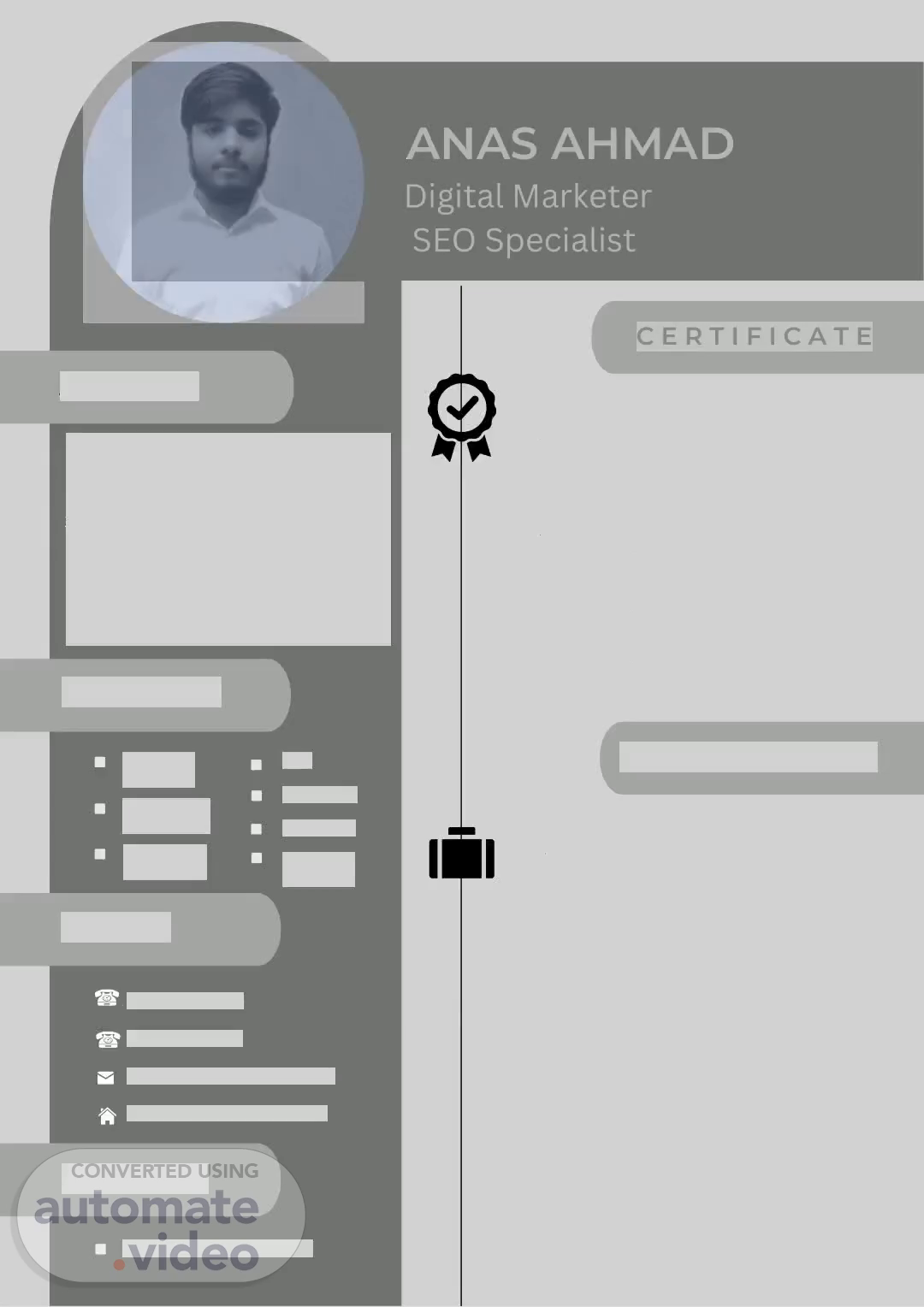 [Virtual Presenter] ANAS AHMAD ABOUT ME I am a highly skilled and experienced SEO, Lead generation, Data entry, and Digital Marketer with a passion for helping businesses succeed online. With three years+ of experience in the industry. My expertise includes everything from on-page optimization and link building to social media marketing. I take a data-driven approach to every project I work on, using analytics and other tools to identify opportunities for growth and optimization. KEY SKILLLS Digital Marketing Social Media Marketing Lead Genaratiom SEO Data Entry wordpress Affiliate Marketing CONTAC +92 309 0884881 +92 344 0093048 [email protected] Renala khurd okara pakistan C E R T I F I C A T E DIGITAL MARKETING (SOCIAL MEDIA MARKETING) SEBS Institute I am working as an SEO Expert on different blogging and Affiliate websites I am working as a social media marketer with different brands. I am working with different companies located in UK and USA as a lead generation and Data Entry expert. DIGITAL MARKETING (SEO) Digital Laps AFFILIATE MARKETING Digiskills.pk WORDPRESS Digiskills.pk WORK EXPERIENCE SEO EXPERT (INTERNSHIP) DIGITAL MARKETING (TRANING + INTERNSHIP) LEAD GENERATION EXPERT Gigia creatives | Sep 2021 - Feb 2022 SEB'S Institute| March 2020 - Aug 2021 Ravian Tech | Jan 2019 - Feb 2020 LANGUAGE English Urdu Digital Marketer SEO Specialist FERRLANCING AND COMUNICATION AND SOFT SKILLS Digiskills.pk Note: All certificate available on demand I am working as an SEO Expert on different services websites SEO EXPERT (TRANING + INTERNSHIP) Digitallaps | March 2022 - July - 20222 I am working as an Off page SEO Expert on different services and blogging websites OFF PAGE SEO EXPERT Xihawks| July 2022 - present.