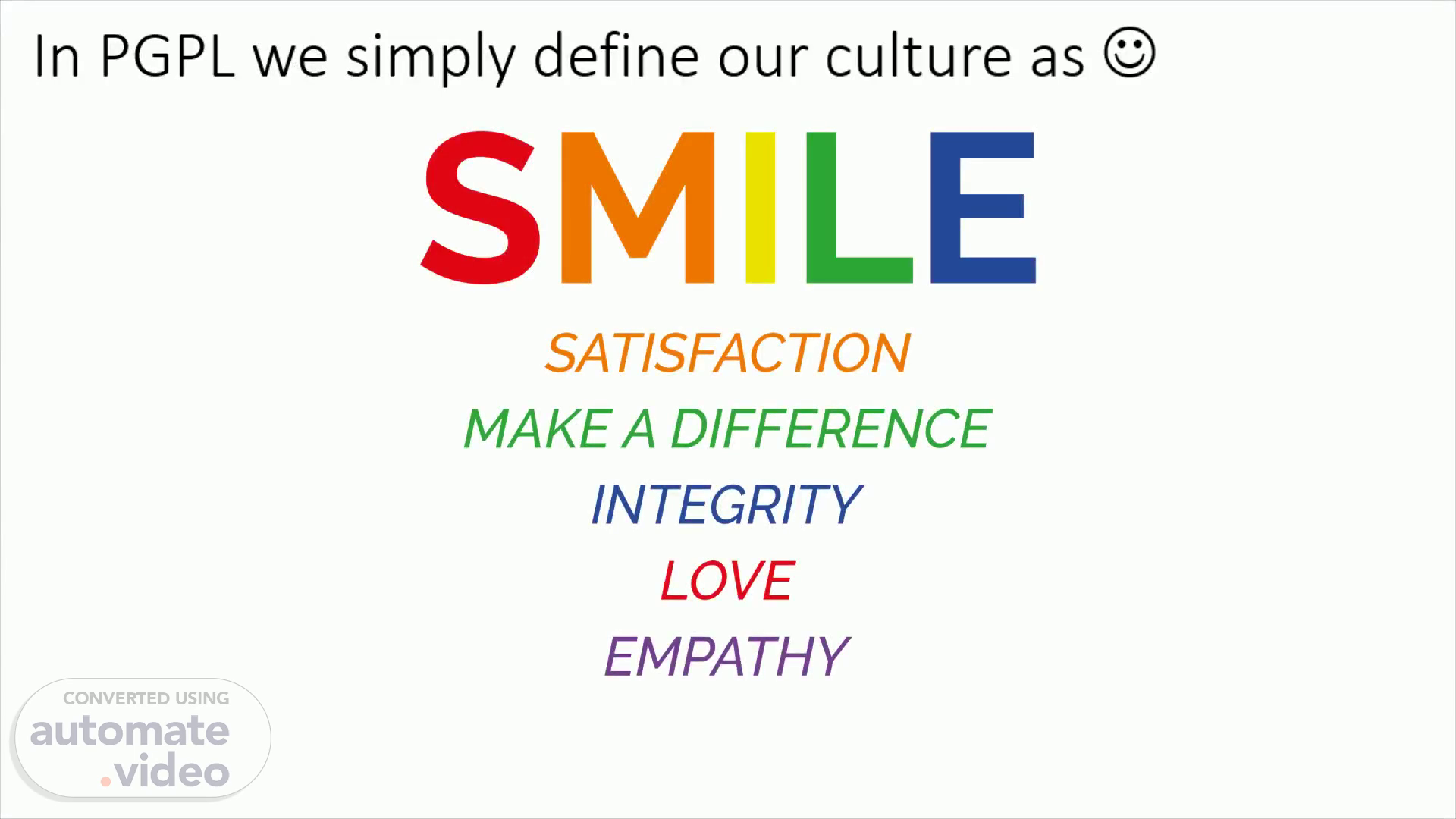 In PGPL we simply define our culture as . SMOLE SATISFACTION MAKE A DIFFERENCE INTEGRITY LOVE EMPATHY.