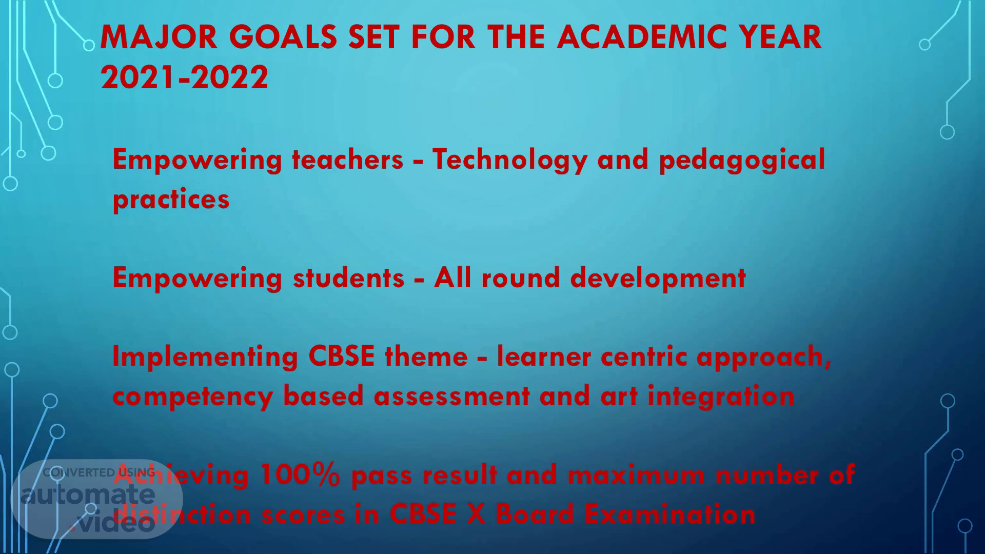 . MAJOR GOALS SET FOR THE ACADEMIC YEAR 2021-2022 Empowering teachers - Technology and pedagogical practices Empowering students - All round development Implementing CBSE theme - learner centric approach, competency based assessment and art integration Achieving 100% pass result and maximum number of distinction scores in CBSE X Board Examination.