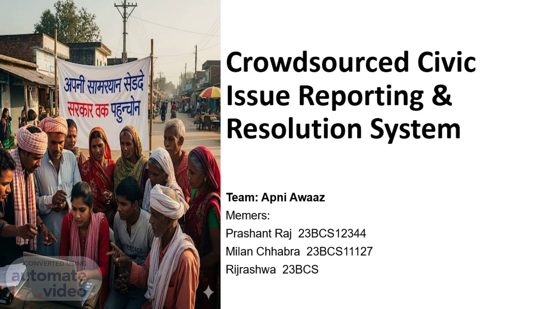 [Audio] Crowdsourced Civic Issue Reporting & Resolution System Team: Apni Awaaz Memers: Prashant Raj 23BCS12344 Milan Chhabra 23BCS11127 Rijrashwa 23BCS.