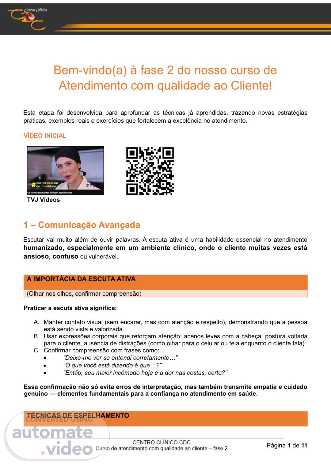 [Audio] Bem vindo(a) à fase 2 do nosso curso de Atendimento com qualidade ao Cliente! Esta etapa foi desenvolvida para aprofundar as técnicas já aprendidas, trazendo novas estratégias práticas, exemplos reais e exercícios que fortalecem a excelência no atendimento. Vídeo Inicial TVJ Vídeos 1 – Comunicação Avançada Escutar vai muito além de ouvir palavras. A escuta ativa é uma habilidade essencial no atendimento humanizado, especialmente em um ambiente clínico, onde o cliente muitas vezes está ansioso, confuso ou vulnerável. A Importâcia Da Escuta Ativa (Olhar nos olhos, confirmar compreensão) Praticar a escuta ativa significa: A Manter contato visual (sem encarar, mas com atenção e respeito), demonstrando que a pessoa está sendo vista e valorizada. B Usar expressões corporais que reforçam atenção: acenos leves com a cabeça, postura voltada para o cliente, ausência de distrações (como olhar para o celular ou tela enquanto o cliente fala). C Confirmar compreensão com frases como: “Deixe me ver se entendi corretamente…” “O que você está dizendo é que…?” “Então, seu maior incômodo hoje é a dor nas costas, certo?” Essa confirmação não só evita erros de interpretação, mas também transmite empatia e cuidado genuíno — elementos fundamentais para a confiança no atendimento em saúde. Técnicas De Espelhamento Página 1 de 11.