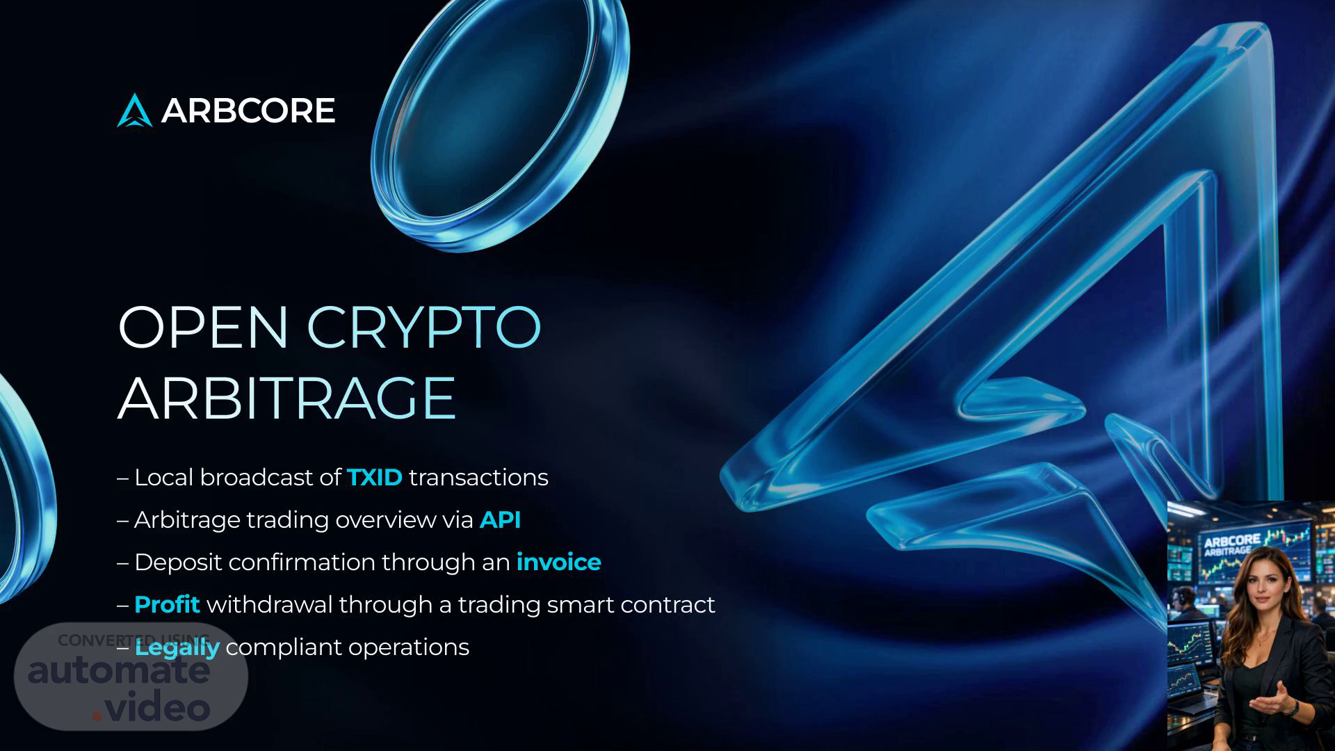 ARBCORE OPEN CRYPTO ARBITRAGE – Local broadcast of transactions TXID – Arbitrage trading overview via API – Deposit confirmation through an invoice – withdrawal through a trading smart contract Profit – Legally compliant operations.