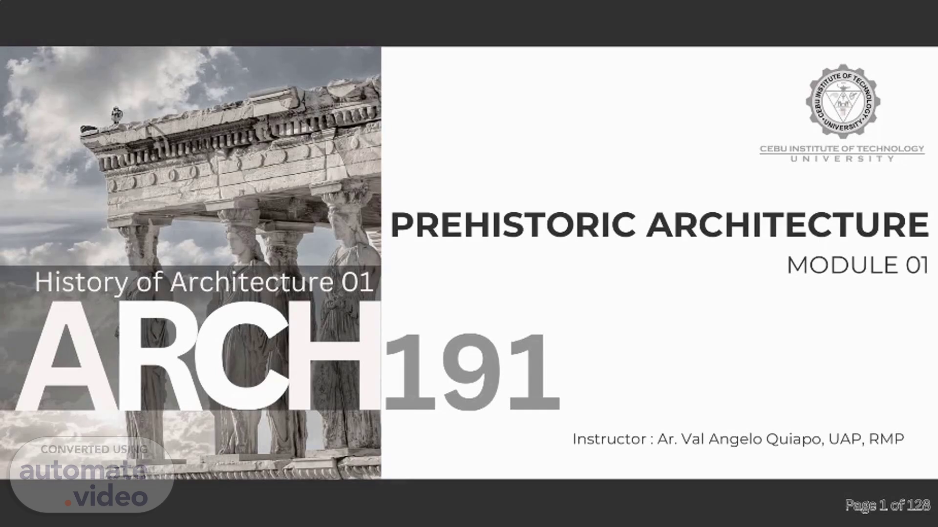 [Audio] In this module, instructor Ar. Val Angelo Quiapo will be discussing the history of prehistoric architecture. We will be exploring the various historic styles that have influenced architecture, including the materials, construction techniques, and cultural and societal influences. By learning about the evolution of these styles, we can develop a deeper understanding and appreciation for the art and science of building. This is the first module in a series of 128 pages, each containing valuable knowledge and insights on the development of architecture. Instructor Ar. Val Angelo Quiapo, UAP, RMP, will guide us through this journey. Our exploration of historic architecture starts on page 13 of 128. Let's continue with this module and uncover the intriguing stories and techniques behind some of the most iconic architectural styles in history..