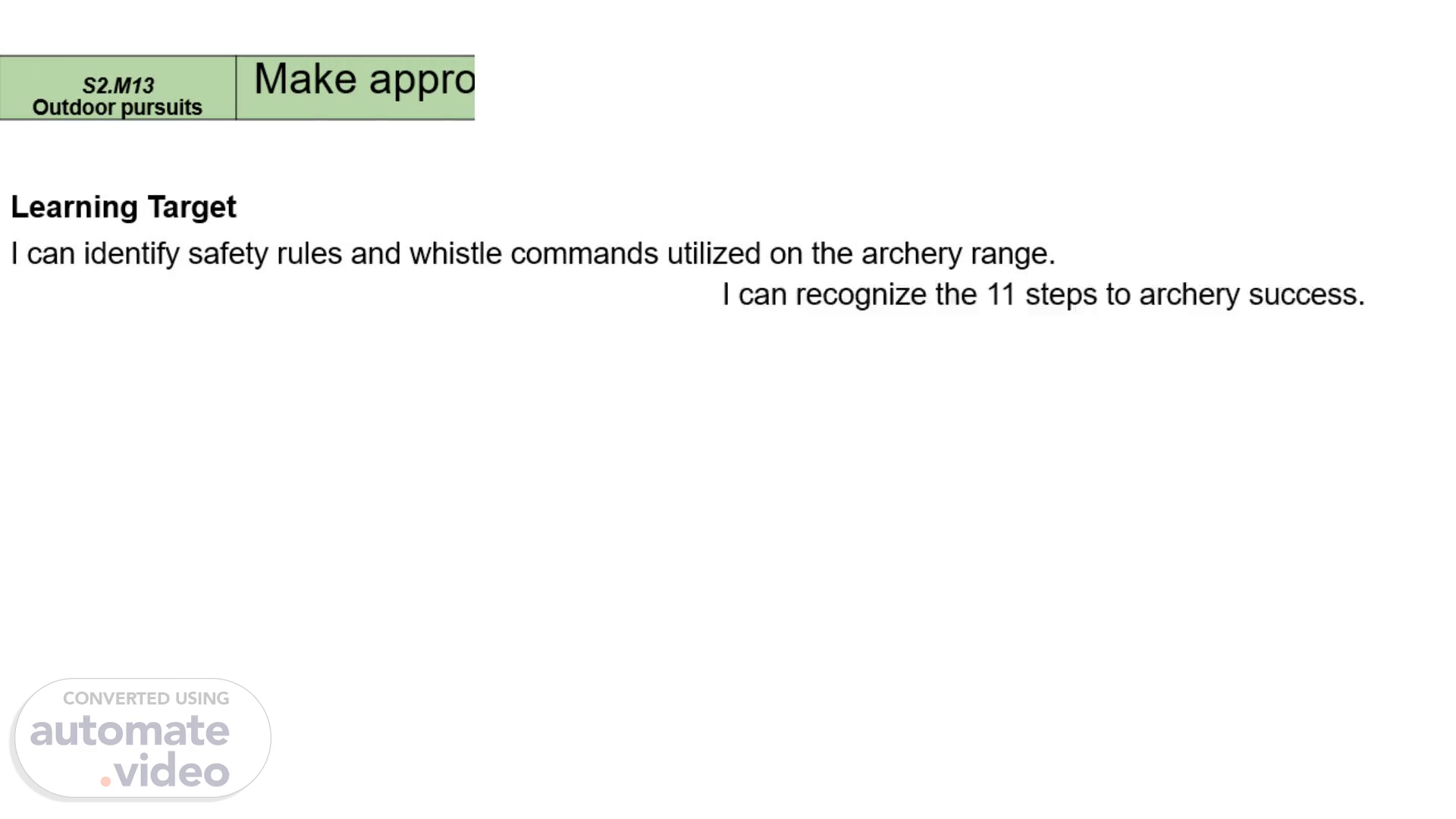 Learning Target I can identify safety rules and whistle commands utilized on the archery range. I can recognize the 11 steps to archery success. I can implement safe protocols participating in archery..