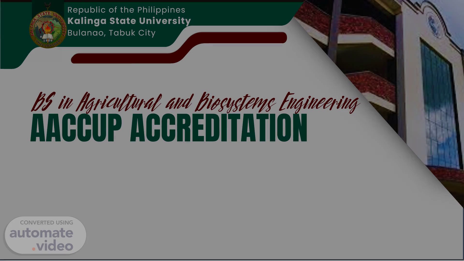 [Audio] Good day. The College of Engineering and Information Technology at Kalinga State University started offering the course Bachelor of Science in Agricultural and Biosystems Engineering in the year nineteen ninety four with a BOT Resolution No. 33. It is a five-year degree program with the following major fields: Soil and Water Resources Management; Agricultural Structures; Environmental Science and Protection, Agricultural Power and machineries, Agricultural Processing and Storage and Electrification. With the drive of the faculty members, the program stands the challenges of time which led it to its current position. With this Level four phase two accreditation, the program is proud to present its accomplishments in the areas of research..