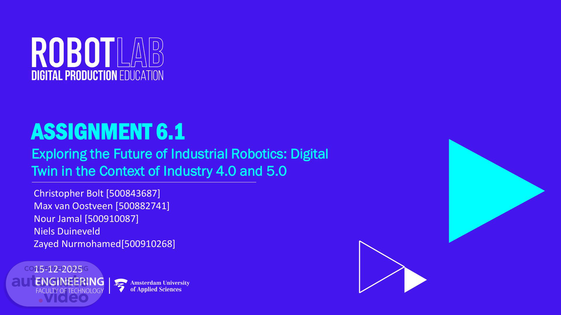 ASSIGNMENT 6.1 Exploring the Future of Industrial Robotics: Digital Twin in the Context of Industry 4.0 and 5.0 Christopher Bolt [500843687] Max van Oostveen [500882741] Nour Jamal [500910087] Niels Duineveld Zayed Nurmohamed[500910268] 15-12-2025.