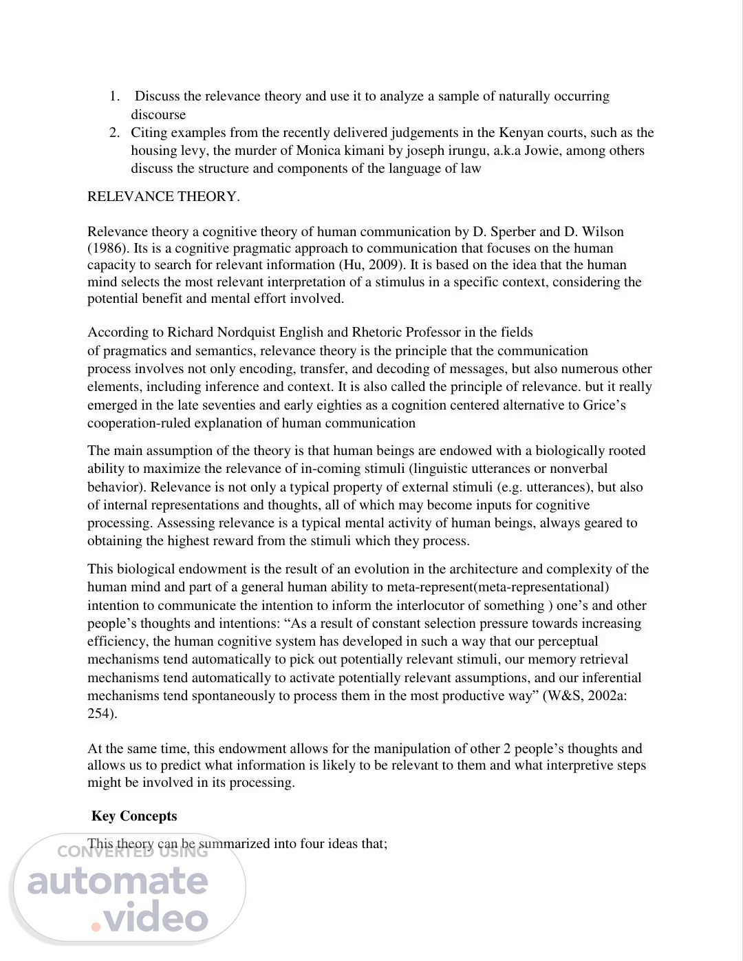 1. Discuss the relevance theory and use it to analyze a sample of naturally occurring discourse 2. Citing examples from the recently delivered judgements in the Kenyan courts, such as the housing levy, the murder of Monica kimani by joseph irungu, a.k.a Jowie, among others discuss the structure and components of the language of law RELEVANCE THEORY. Relevance theory a cognitive theory of human communication by D. Sperber and D. Wilson (1986). Its is a cognitive pragmatic approach to communication that focuses on the human capacity to search for relevant information (Hu, 2009). It is based on the idea that the human mind selects the most relevant interpretation of a stimulus in a specific context, considering the potential benefit and mental effort involved. According to Richard Nordquist English and Rhetoric Professor in the fields of pragmatics and semantics, relevance theory is the principle that the communication process involves not only encoding, transfer, and decoding of messages, but also numerous other elements, including inference and context. It is also called the principle of relevance. but it really emerged in the late seventies and early eighties as a cognition centered alternative to Grice’s cooperation-ruled explanation of human communication The main assumption of the theory is that human beings are endowed with a biologically rooted ability to maximize the relevance of in-coming stimuli (linguistic utterances or nonverbal behavior). Relevance is not only a typical property of external stimuli (e.g. utterances), but also of internal representations and thoughts, all of which may become inputs for cognitive processing. Assessing relevance is a typical mental activity of human beings, always geared to obtaining the highest reward from the stimuli which they process. This biological endowment is the result of an evolution in the architecture and complexity of the human mind and part of a general human ability to meta-represent(meta-representational) intention to communicate the intention to inform the interlocutor of something ) one’s and other people’s thoughts and intentions: “As a result of constant selection pressure towards increasing efficiency, the human cognitive system has developed in such a way that our perceptual mechanisms tend automatically to pick out potentially relevant stimuli, our memory retrieval mechanisms tend automatically to activate potentially relevant assumptions, and our inferential mechanisms tend spontaneously to process them in the most productive way” (W&S, 2002a: 254). At the same time, this endowment allows for the manipulation of other 2 people’s thoughts and allows us to predict what information is likely to be relevant to them and what interpretive steps might be involved in its processing. Key Concepts This theory can be summarized into four ideas that;.