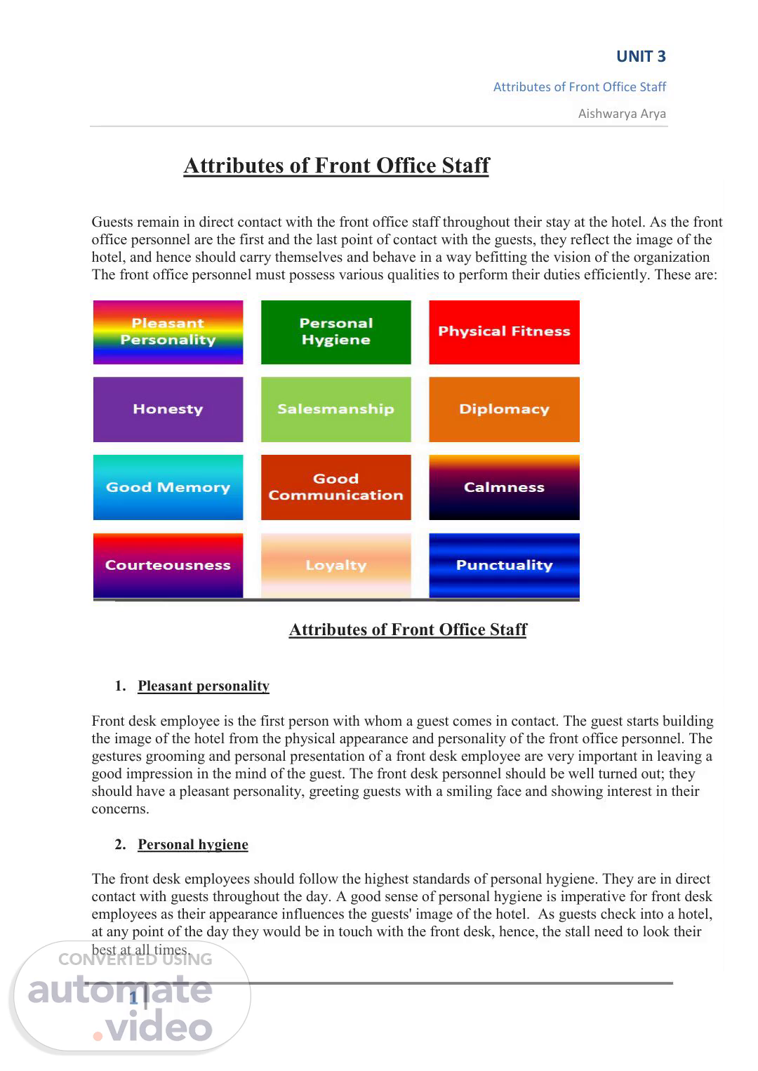 [Audio] UNIT 3 Attributes of Front Office Staff Aishwarya Arya Attributes of Front Office Staff Guests remain in direct contact with the front office staff throughout their stay at the hotel. As the front office personnel are the first and the last point of contact with the guests, they reflect the image of the hotel, and hence should carry themselves and behave in a way befitting the vision of the organization The front office personnel must possess various qualities to perform their duties efficiently. These are: Attributes of Front Office Staff 1. Pleasant personality Front desk employee is the first person with whom a guest comes in contact. The guest starts building the image of the hotel from the physical appearance and personality of the front office personnel. The gestures grooming and personal presentation of a front desk employee are very important in leaving a good impression in the mind of the guest. The front desk personnel should be well turned out; they should have a pleasant personality, greeting guests with a smiling face and showing interest in their concerns. 2. Personal hygiene The front desk employees should follow the highest standards of personal hygiene. They are in direct contact with guests throughout the day. A good sense of personal hygiene is imperative for front desk employees as their appearance influences the guests' image of the hotel. As guests check into a hotel, at any point of the day they would be in touch with the front desk, hence, the stall need to look their best at all times. 1.