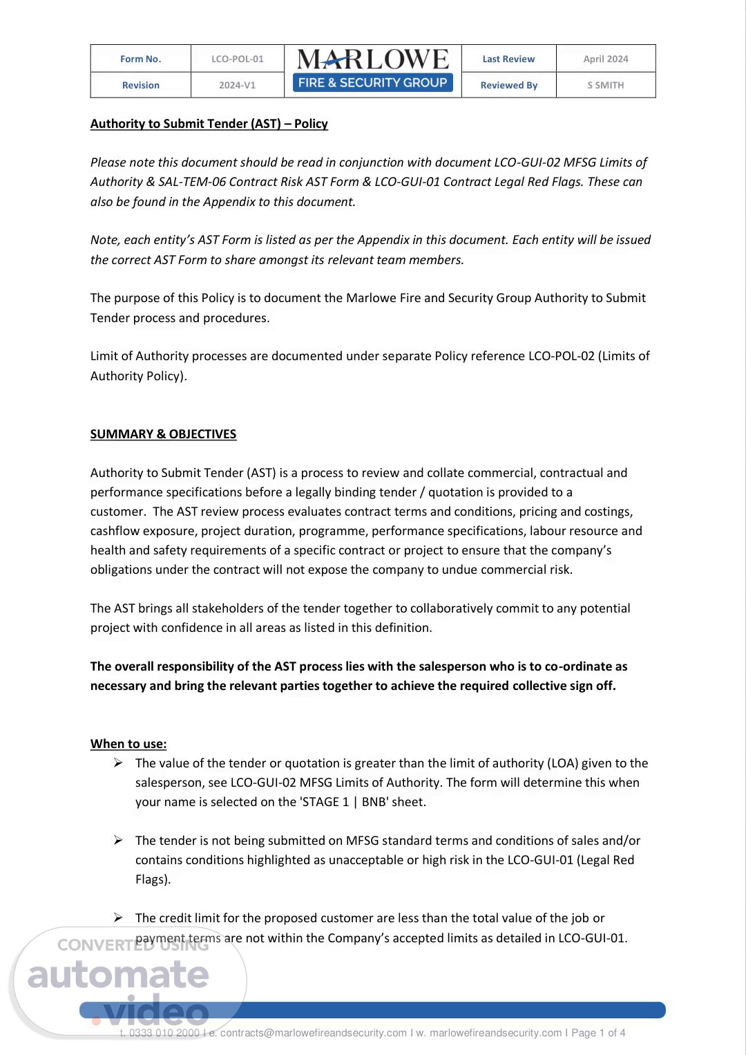 [Audio] Form No. LCO-POL-01 Last Review April 2024 Revision 2024-V1 Reviewed By S SMITH Authority to Submit Tender (AST) – Policy Please note this document should be read in conjunction with document LCO-GUI-02 MFSG Limits of Authority & SAL-TEM-06 Contract Risk AST Form & LCO-GUI-01 Contract Legal Red Flags. These can also be found in the Appendix to this document. Note, each entity's AST Form is listed as per the Appendix in this document. Each entity will be issued the correct AST Form to share amongst its relevant team members. The purpose of this Policy is to document the Marlowe Fire and Security Group Authority to Submit Tender process and procedures. Limit of Authority processes are documented under separate Policy reference LCO-POL-02 (Limits of Authority Policy). SUMMARY & OBJECTIVES Authority to Submit Tender (AST) is a process to review and collate commercial, contractual and performance specifications before a legally binding tender / quotation is provided to a customer. The AST review process evaluates contract terms and conditions, pricing and costings, cashflow exposure, project duration, programme, performance specifications, labour resource and health and safety requirements of a specific contract or project to ensure that the company's obligations under the contract will not expose the company to undue commercial risk. The AST brings all stakeholders of the tender together to collaboratively commit to any potential project with confidence in all areas as listed in this definition. The overall responsibility of the AST process lies with the salesperson who is to co-ordinate as necessary and bring the relevant parties together to achieve the required collective sign off. When to use: The value of the tender or quotation is greater than the limit of authority (LOA) given to the salesperson, see LCO-GUI-02 MFSG Limits of Authority. The form will determine this when your name is selected on the 'STAGE 1 | BNB' sheet. The tender is not being submitted on MFSG standard terms and conditions of sales and/or contains conditions highlighted as unacceptable or high risk in the LCO-GUI-01 (Legal Red Flags). The credit limit for the proposed customer are less than the total value of the job or payment terms are not within the Company's accepted limits as detailed in LCO-GUI-01. t. 0333 010 2000 I e. [email protected] I w. marlowefireandsecurity.com I Page 1 of 4.