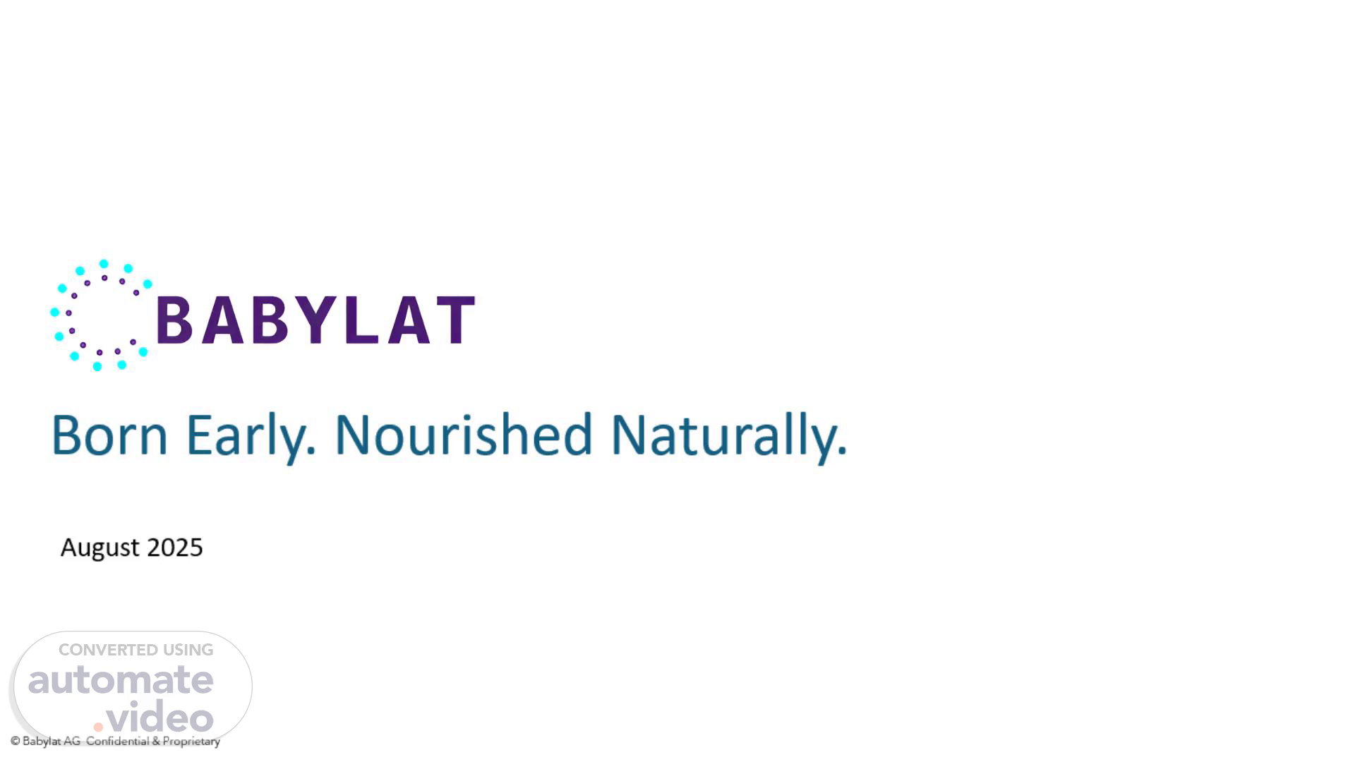 [Audio] This is our training video, where we will be discussing the topic of "Born Early. Nourished Naturally." The presentation is brought to you by Babylat AG, and we are eager to share our insights and knowledge with you. As we explore this topic, we request that you approach it with an open mind and be prepared to learn about the most recent advancements in the field. So let's begin and delve into the world of natural nourishment. This is the first of 23 slides, so let's get started!.