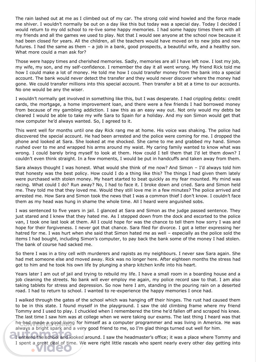 [Audio] The rain lashed out at me as I climbed out of my car. The strong cold wind howled and the force made me shiver. I wouldn't normally be out on a day like this but today was a special day. Today I decided I would return to my old school to re-live some happy memories. I had some happy times there with all my friends and all the games we used to play. Not that I would see anyone at the school now because it had been closed for years. All the children, all the teachers would have moved on to new jobs and new futures. I had the same as them – a job in a bank, good prospects, a beautiful wife, and a healthy son. What more could a man ask for? Those were happy times and cherished memories. Sadly, memories are all I have left now. I lost my job, my wife, my son, and my self-confidence. I remember the day it all went wrong. My friend Rick told me how I could make a lot of money. He told me how I could transfer money from the bank into a special account. The bank would never detect the transfer and they would never discover where the money had gone. We could transfer millions into this special account. Then transfer a bit at a time to our accounts. No one would be any the wiser. I wouldn't normally get involved in something like this, but I was desperate. I had crippling debts: credit cards, the mortgage, a home improvement loan, and there were a few friends I had borrowed money from because of my gambling addiction. I saw this as an easy way out. Not only would my debts be cleared I would be able to take my wife Sara to Spain for a holiday. And my son Simon would get that new computer he'd always wanted. So, I agreed to it. This went well for months until one day Rick rang me at home. His voice was shaking. The police had discovered the special account. He had been arrested and the police were coming for me. I dropped the phone and looked at Sara. She looked at me shocked. She came to me and grabbed my hand. Simon rushed over to me and wrapped his arms around my waist. My caring family wanted to know what was wrong. I could barely bring myself to look at them. How could I tell them that I'd let them down? I couldn't even think straight. In a few moments, I would be put in handcuffs and taken away from them. Sara always thought I was honest. What would she think of me now? And Simon – I'd always told him that honesty was the best policy. How could I do a thing like this? The things I had given them lately were purchased with stolen money. My heart started to beat quickly as my fear mounted. My mind was racing. What could I do? Run away? No, I had to face it. I broke down and cried. Sara and Simon held me. They told me that they loved me. Would they still love me in a few minutes? The police arrived and arrested me. How Sara and Simon took the news that I was a common thief I don't know. I couldn't face them as my.