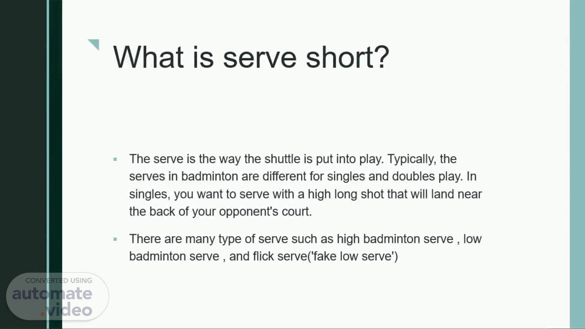 What is serve short?. The serve is the way the shuttle is put into play. Typically, the serves in badminton are different for singles and doubles play. In singles, you want to serve with a high long shot that will land near the back of your opponent's court. There are many type of serve such as high badminton serve , low badminton serve , and flick serve('fake low serve').