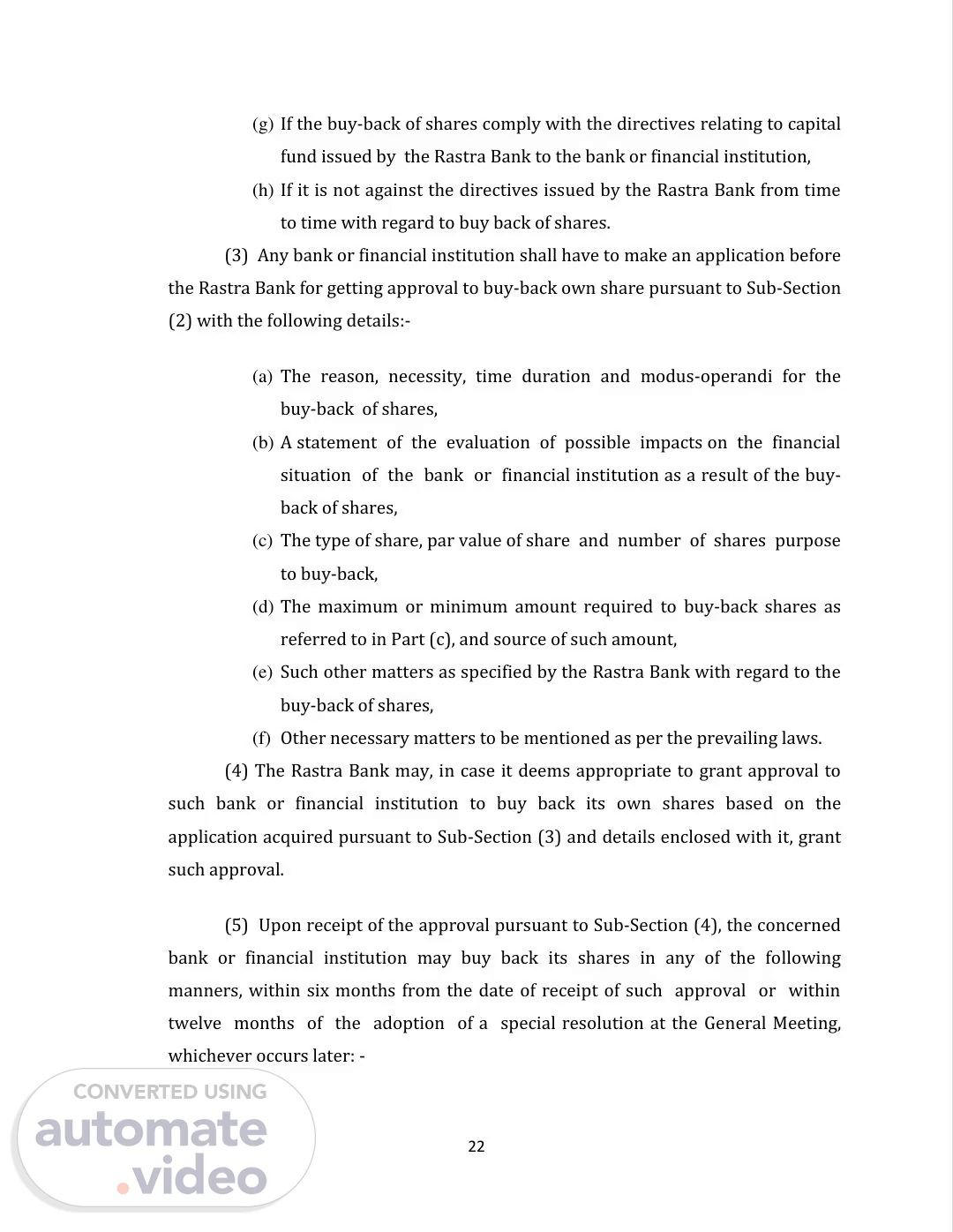 22 (g) If the buy-back of shares comply with the directives relating to capital fund issued by the Rastra Bank to the bank or financial institution, (h) If it is not against the directives issued by the Rastra Bank from time to time with regard to buy back of shares. (3) Any bank or financial institution shall have to make an application before the Rastra Bank for getting approval to buy-back own share pursuant to Sub-Section (2) with the following details:- (a) The reason, necessity, time duration and modus-operandi for the buy-back of shares, (b) A statement of the evaluation of possible impacts on the financial situation of the bank or financial institution as a result of the buy- back of shares, (c) The type of share, par value of share and number of shares purpose to buy-back, (d) The maximum or minimum amount required to buy-back shares as referred to in Part (c), and source of such amount, (e) Such other matters as specified by the Rastra Bank with regard to the buy-back of shares, (f) Other necessary matters to be mentioned as per the prevailing laws. (4) The Rastra Bank may, in case it deems appropriate to grant approval to such bank or financial institution to buy back its own shares based on the application acquired pursuant to Sub-Section (3) and details enclosed with it, grant such approval. (5) Upon receipt of the approval pursuant to Sub-Section (4), the concerned bank or financial institution may buy back its shares in any of the following manners, within six months from the date of receipt of such approval or within twelve months of the adoption of a special resolution at the General Meeting, whichever occurs later: -.
