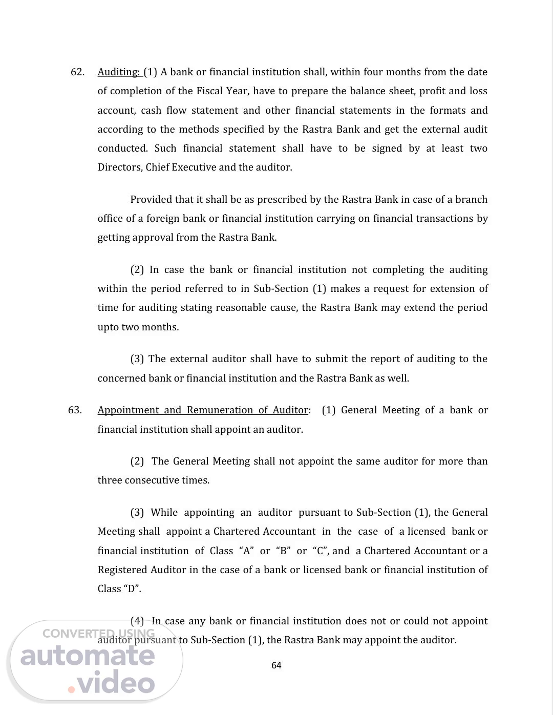 64 62. Auditing: (1) A bank or financial institution shall, within four months from the date of completion of the Fiscal Year, have to prepare the balance sheet, profit and loss account, cash flow statement and other financial statements in the formats and according to the methods specified by the Rastra Bank and get the external audit conducted. Such financial statement shall have to be signed by at least two Directors, Chief Executive and the auditor. Provided that it shall be as prescribed by the Rastra Bank in case of a branch office of a foreign bank or financial institution carrying on financial transactions by getting approval from the Rastra Bank. (2) In case the bank or financial institution not completing the auditing within the period referred to in Sub-Section (1) makes a request for extension of time for auditing stating reasonable cause, the Rastra Bank may extend the period upto two months. (3) The external auditor shall have to submit the report of auditing to the concerned bank or financial institution and the Rastra Bank as well. 63. Appointment and Remuneration of Auditor: (1) General Meeting of a bank or financial institution shall appoint an auditor. (2) The General Meeting shall not appoint the same auditor for more than three consecutive times. (3) While appointing an auditor pursuant to Sub-Section (1), the General Meeting shall appoint a Chartered Accountant in the case of a licensed bank or financial institution of Class “A” or “B” or “C”, and a Chartered Accountant or a Registered Auditor in the case of a bank or licensed bank or financial institution of Class “D”. (4) In case any bank or financial institution does not or could not appoint auditor pursuant to Sub-Section (1), the Rastra Bank may appoint the auditor..