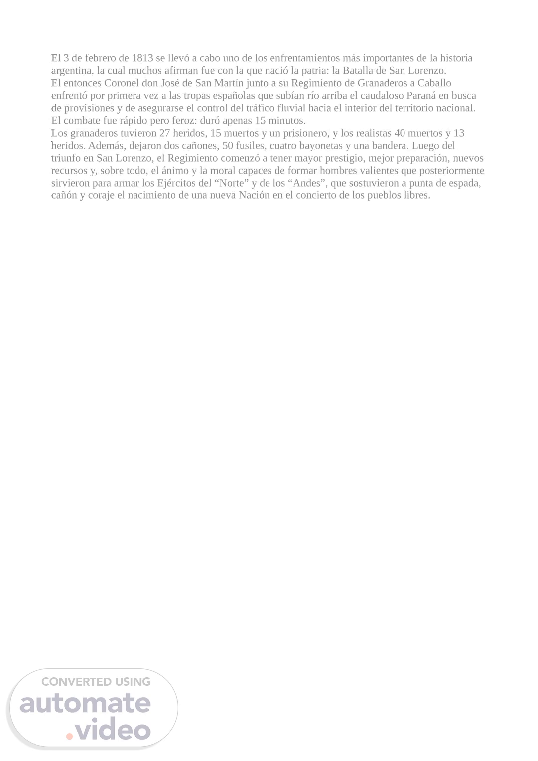 [Virtual Presenter] El 3 de febrero de 1813 se llevó a cabo uno de los enfrentamientos más importantes de la historia argentina, la cual muchos afirman fue con la que nació la patria: la Batalla de San Lorenzo. El entonces Coronel don José de San Martín junto a su Regimiento de Granaderos a Caballo enfrentó por primera vez a las tropas españolas que subían río arriba el caudaloso Paraná en busca de provisiones y de asegurarse el control del tráfico fluvial hacia el interior del territorio nacional. El combate fue rápido pero feroz: duró apenas 15 minutos. Los granaderos tuvieron 27 heridos, 15 muertos y un prisionero, y los realistas 40 muertos y 13 heridos. Además, dejaron dos cañones, 50 fusiles, cuatro bayonetas y una bandera. Luego del triunfo en San Lorenzo, el Regimiento comenzó a tener mayor prestigio, mejor preparación, nuevos recursos y, sobre todo, el ánimo y la moral capaces de formar hombres valientes que posteriormente sirvieron para armar los Ejércitos del “Norte” y de los “Andes”, que sostuvieron a punta de espada, cañón y coraje el nacimiento de una nueva Nación en el concierto de los pueblos libres..