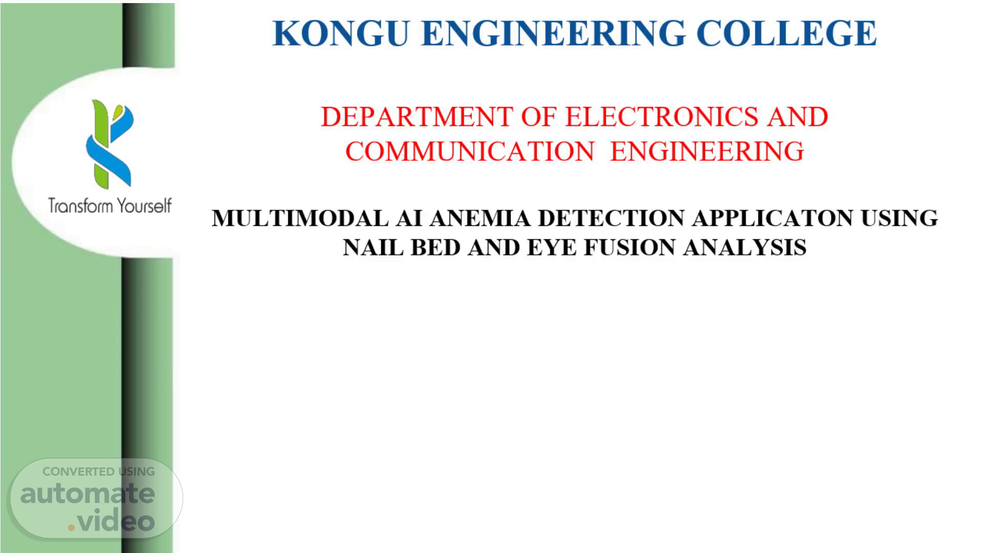 [Audio] KONGU ENGINEERING COLLEGE DEPARTMENT OF ELECTRONICS AND COMMUNICATION ENGINEERING MULTIMODAL AI ANEMIA DETECTION APPLICATON USING NAIL BED AND EYE FUSION ANALYSIS PROJECT BY: PROJECT GUIDE: 22ECR207 – SWATHI M Dr. T. MEERA DEVI 22ECR211 – THAARINI S PROFESSOR /ECE 22ECR233 – VINUDHARAN M.