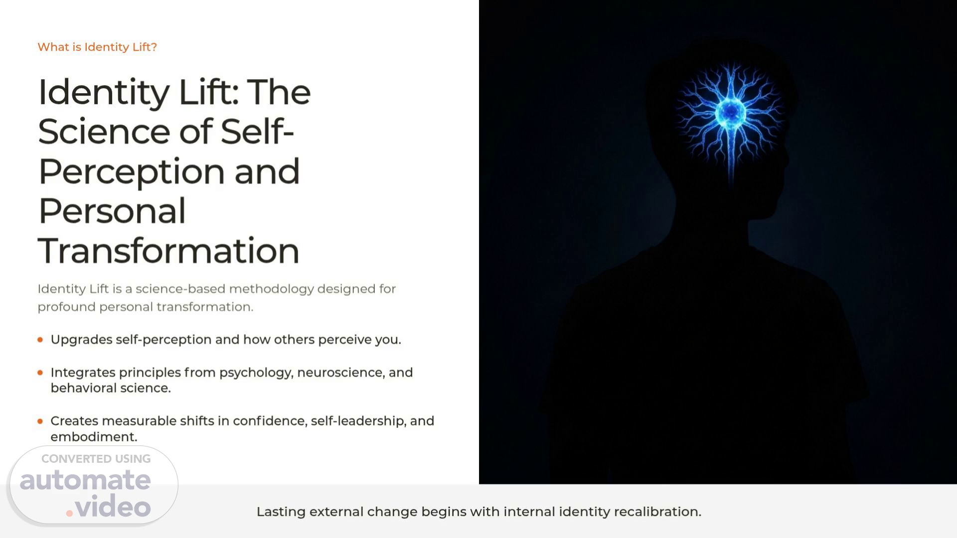 What is Identity Lift? Identity Lift: The Science of Self- Perception and personal Transformation Identity Lift is a science-based methodology designed for profound personal transformation. • Upgrades self-perception and how others perceive you. • Integrates principles from psychology, neuroscience, and behavioral science. • Creates measurable shifts in confidence, self-leadership, and embodiment. Lasting external change begins with internal identity recalibration..